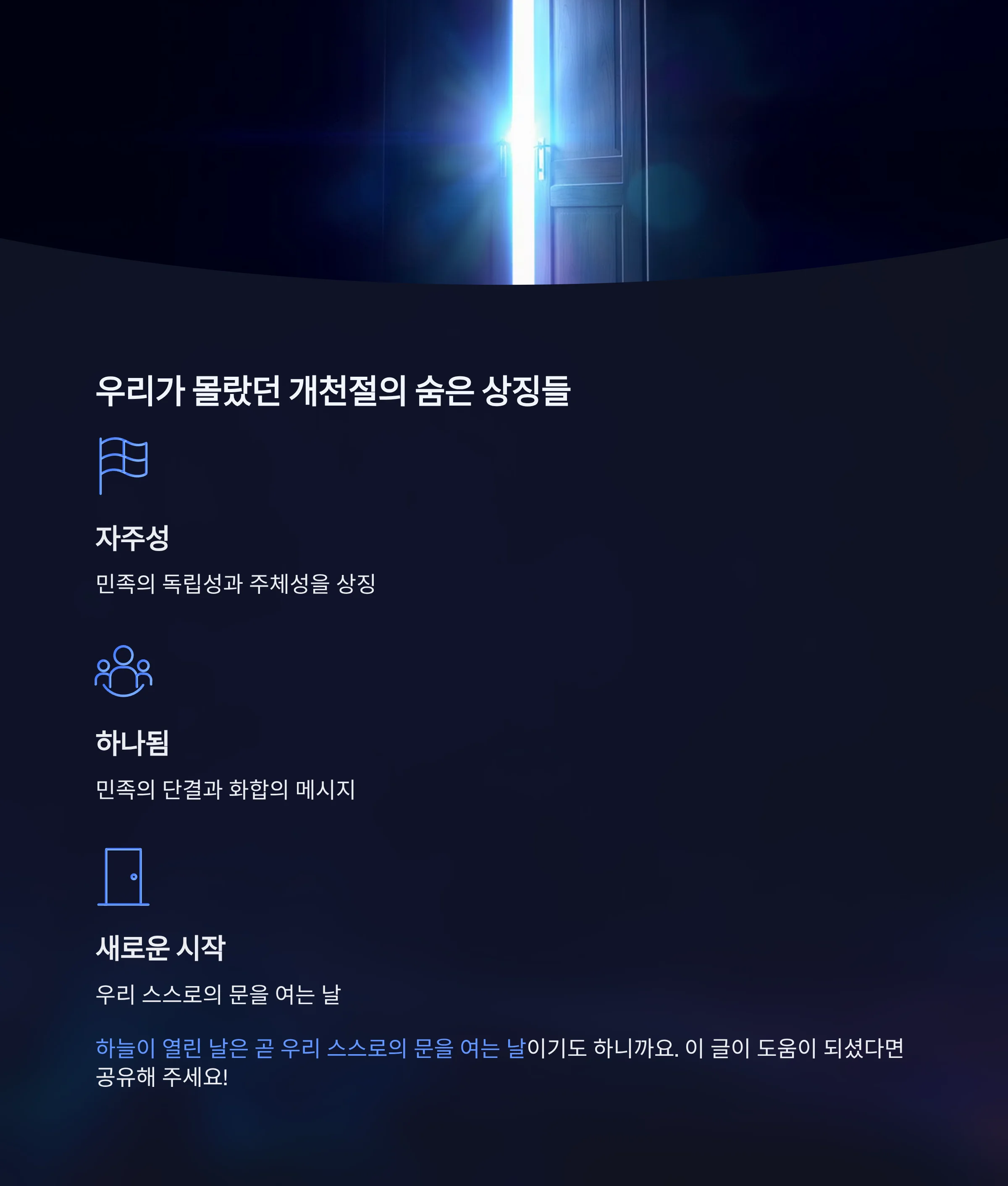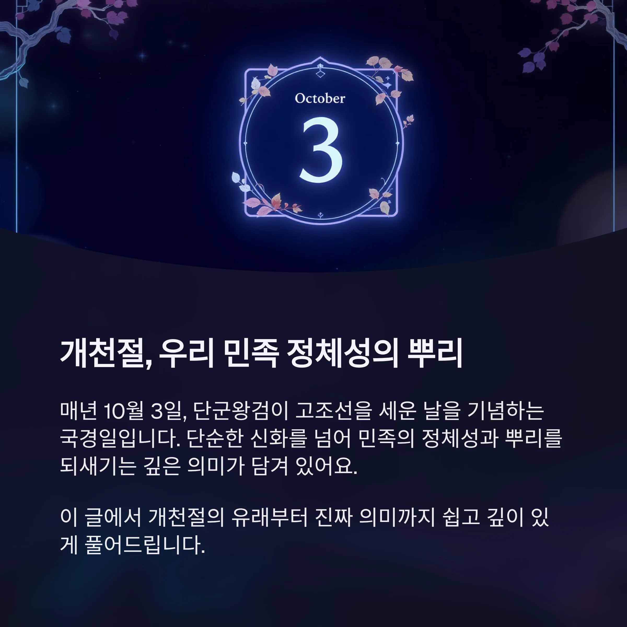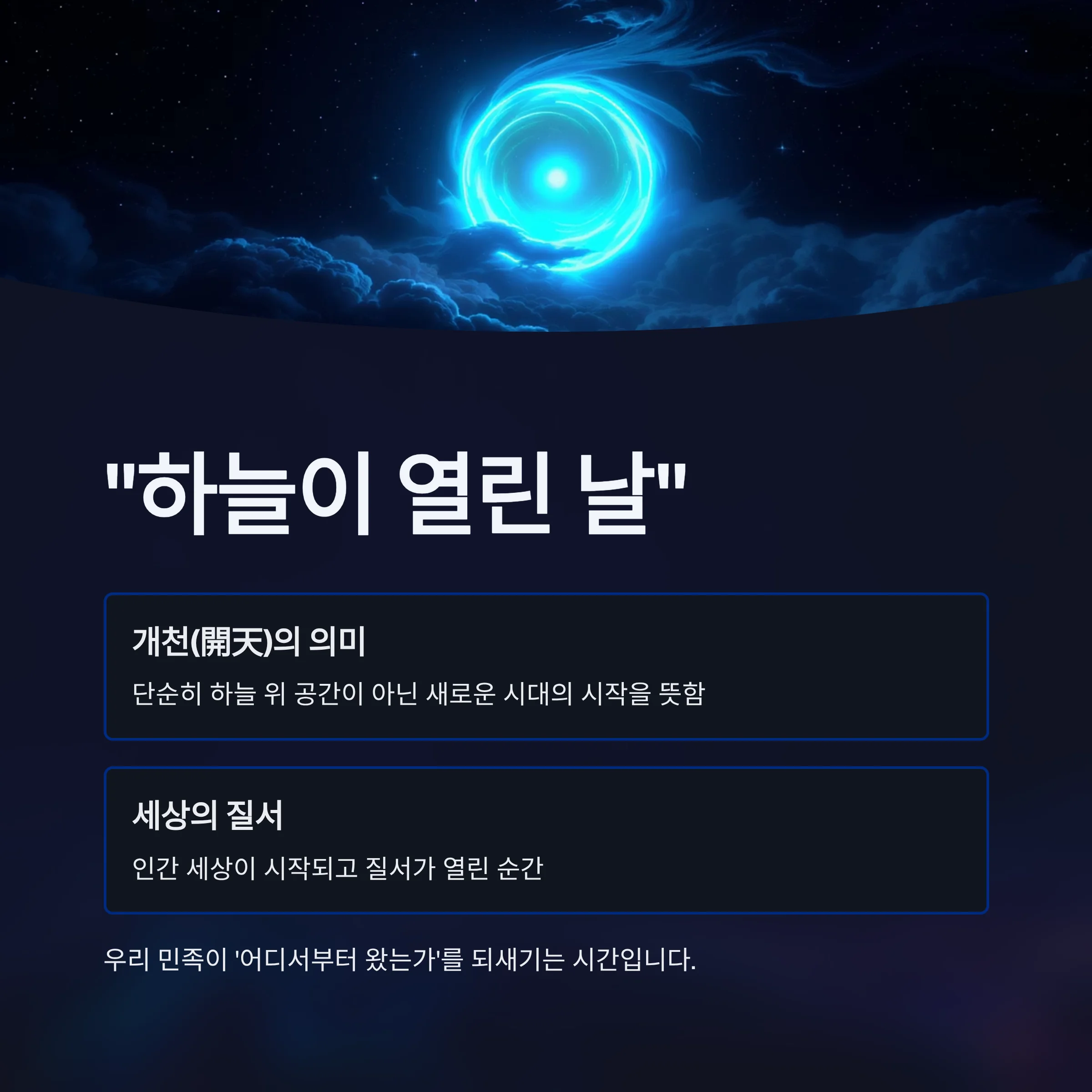단순한 신화나 전설을 넘어서 민족의 정체성과 뿌리를 되새기는 날로, 그 깊은 의미를 알고 나면 단순한 ‘쉬는 날’ 이상의 가치를 느낄 수 있습니다.