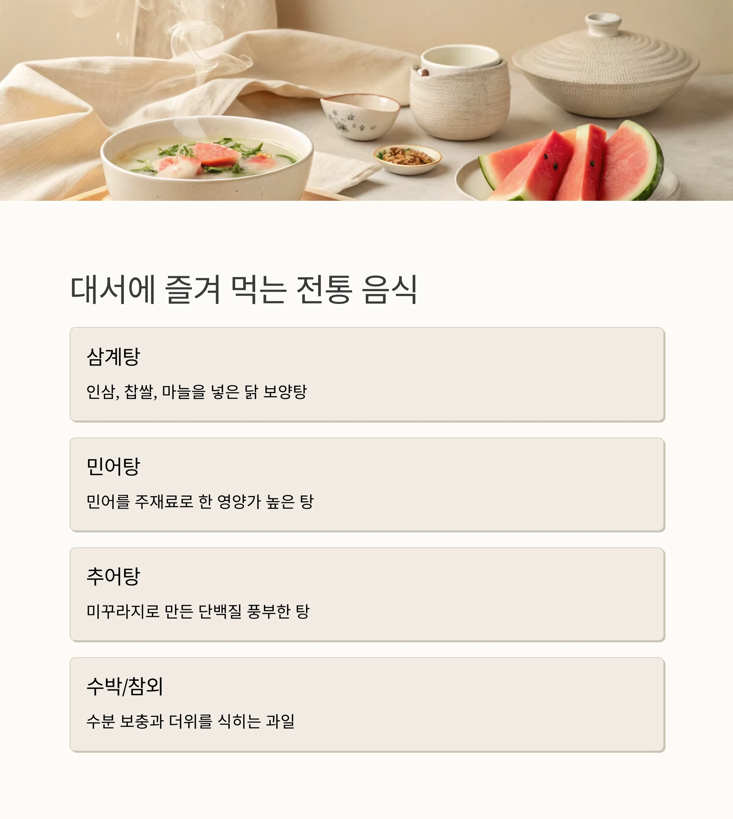 대서에는 무더위를 이겨내기 위해 보양식으로 삼계탕, 민어탕, 추어탕 등을 먹는 풍습이 있습니다.