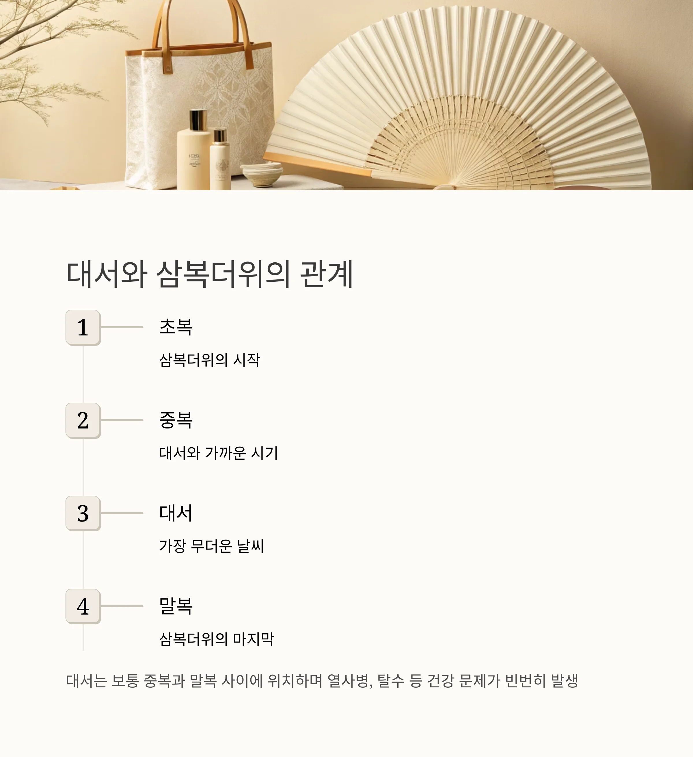 따라서 대서 기간은 열사병, 탈수 등의 건강 문제가 가장 빈번히 발생하는 시기이기도 합니다.