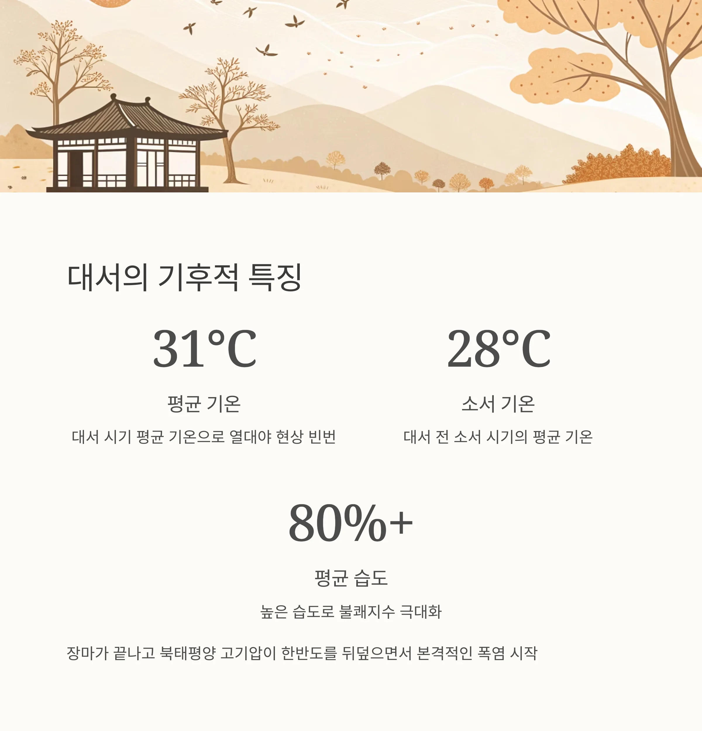 | 대서 | 약 31도 | 고온 지속, 열대야 증가 |