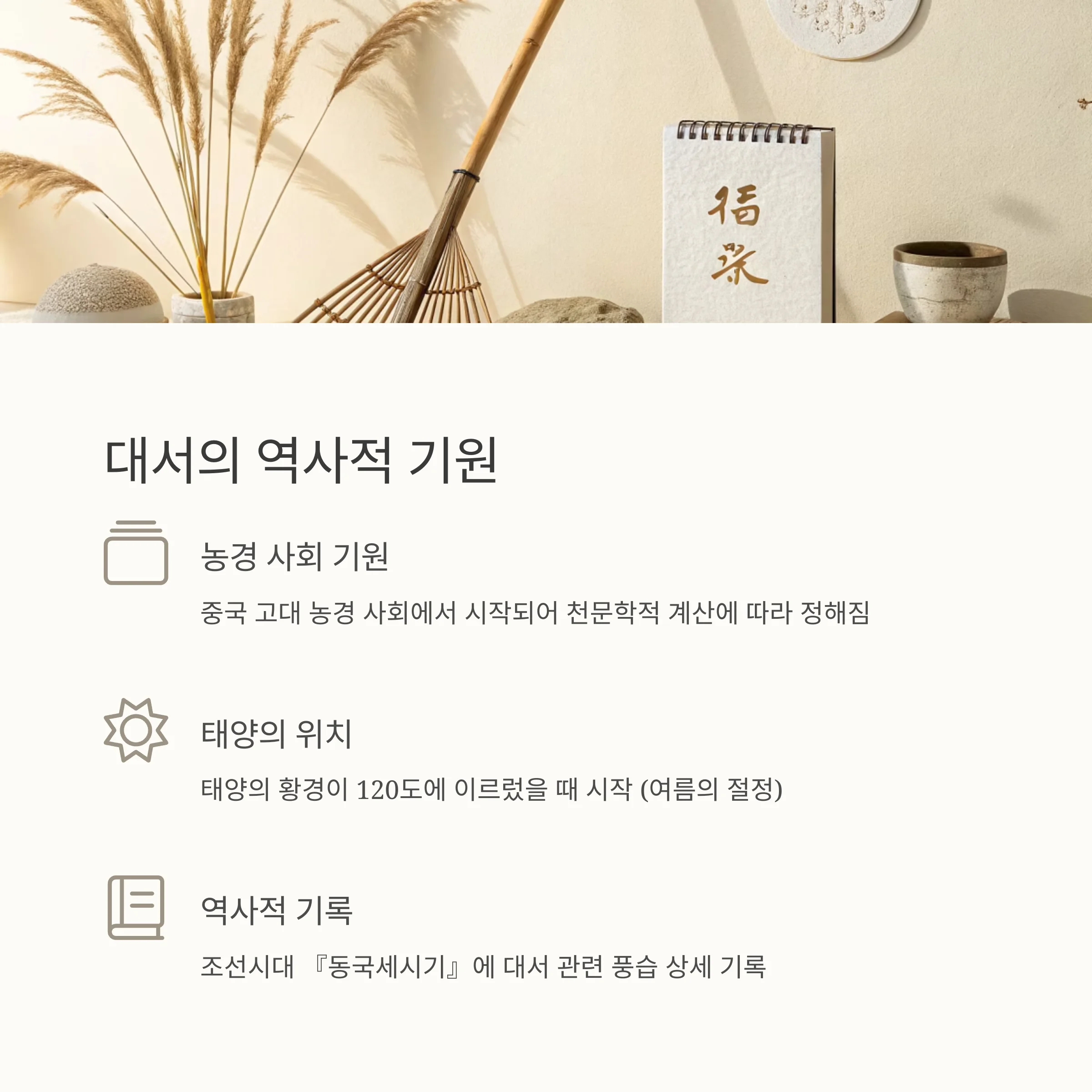 조선시대 『동국세시기』와 같은 기록물에서도 대서 시기의 무더위와 관련된 다양한 민속 풍습이 등장합니다.