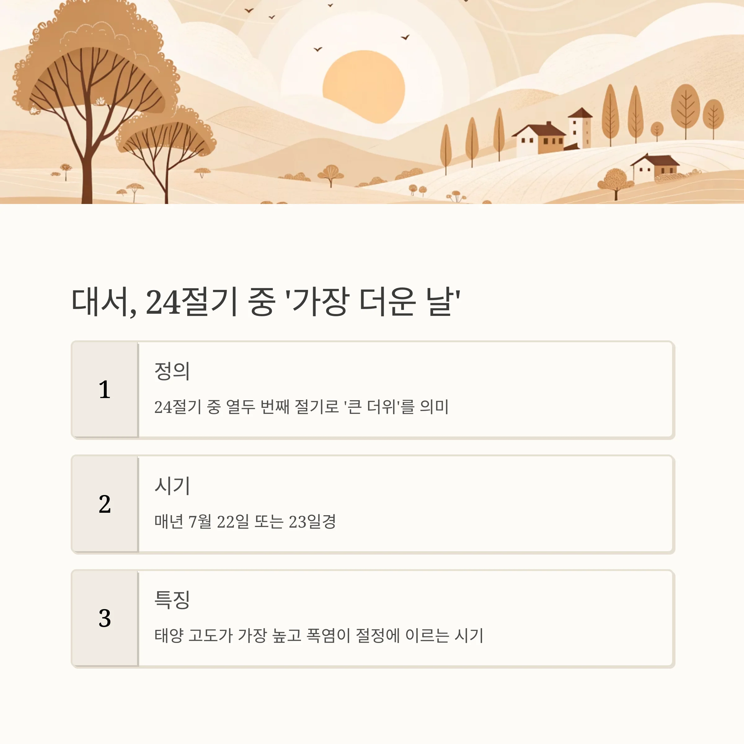 이번 글에서는 대서의 정확한 뜻과 유래, 풍습과 기후적 특징까지 모두 정리해 드리겠습니다.