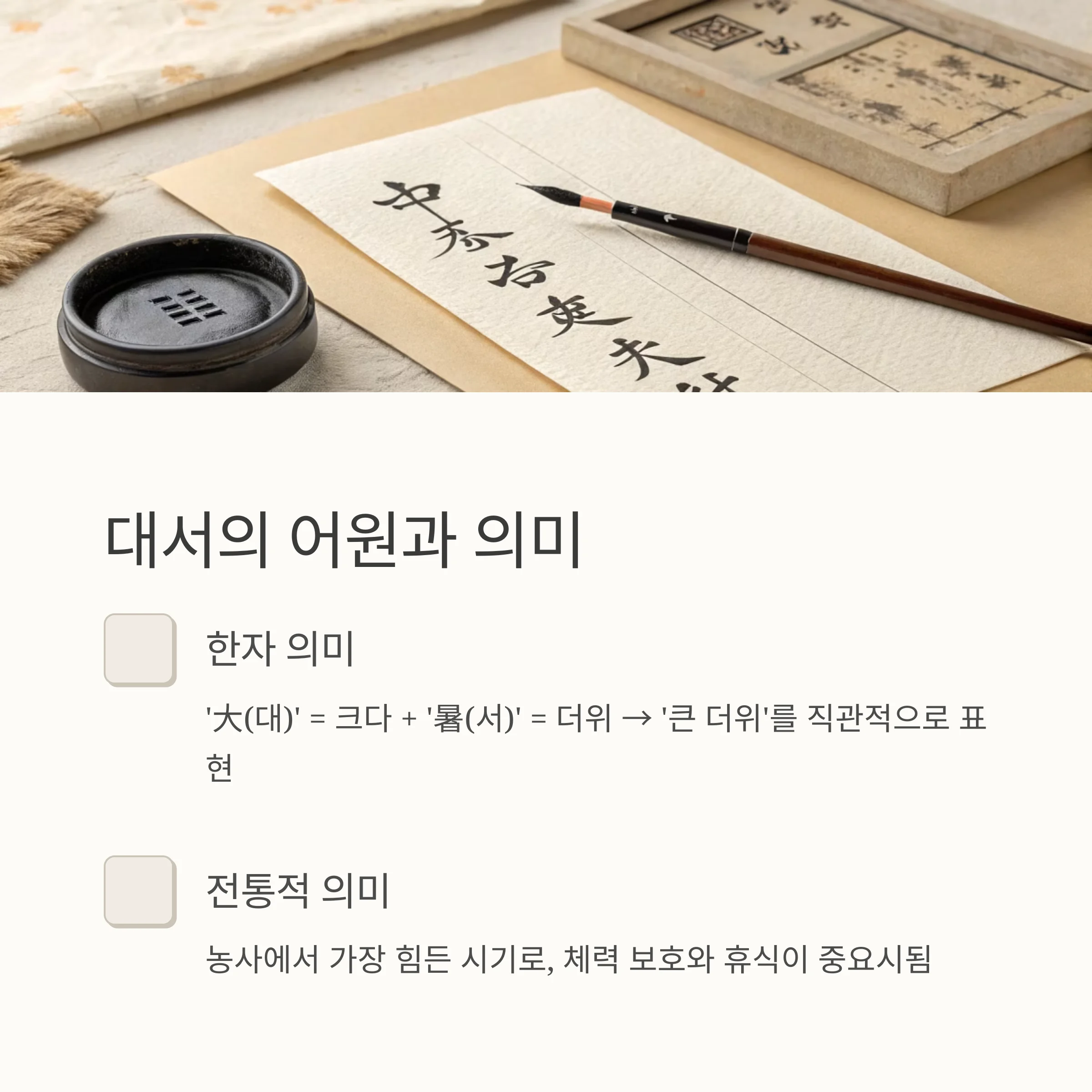 ‘大’는 크다는 의미, ‘暑’는 더위를 나타내며 두 글자가 합쳐져서 '가장 더운 절기'라는 직관적인 의미를 전달합니다.