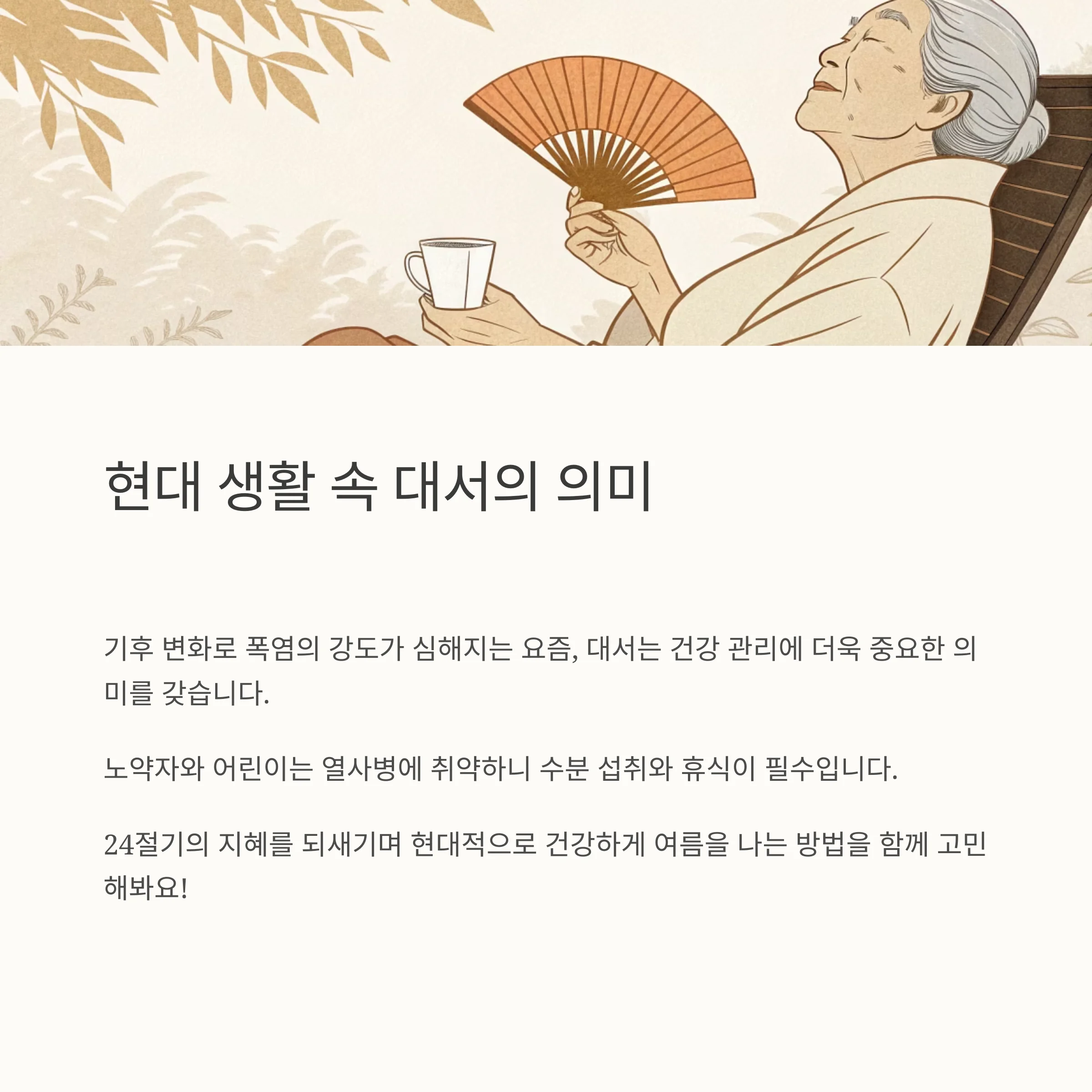 현대에서는 실내 냉방시설과 다양한 정보로 더위를 일정 부분 피할 수 있게 되었지만, 여전히 대서는 건강 관리에 있어 각별한 주의가 요구되는 시기입니다.