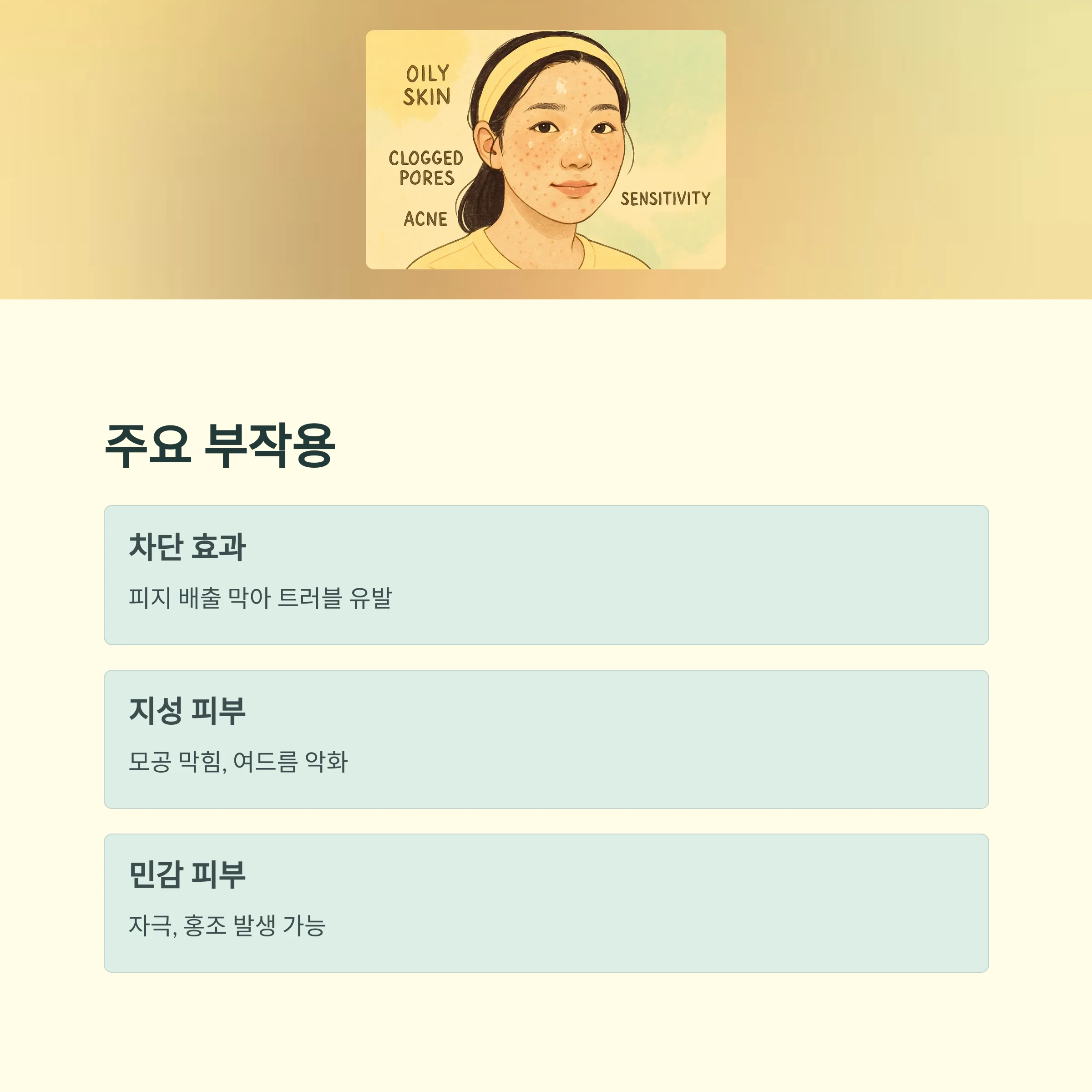 | 지성 피부 | 모공 막힘, 여드름 악화 |