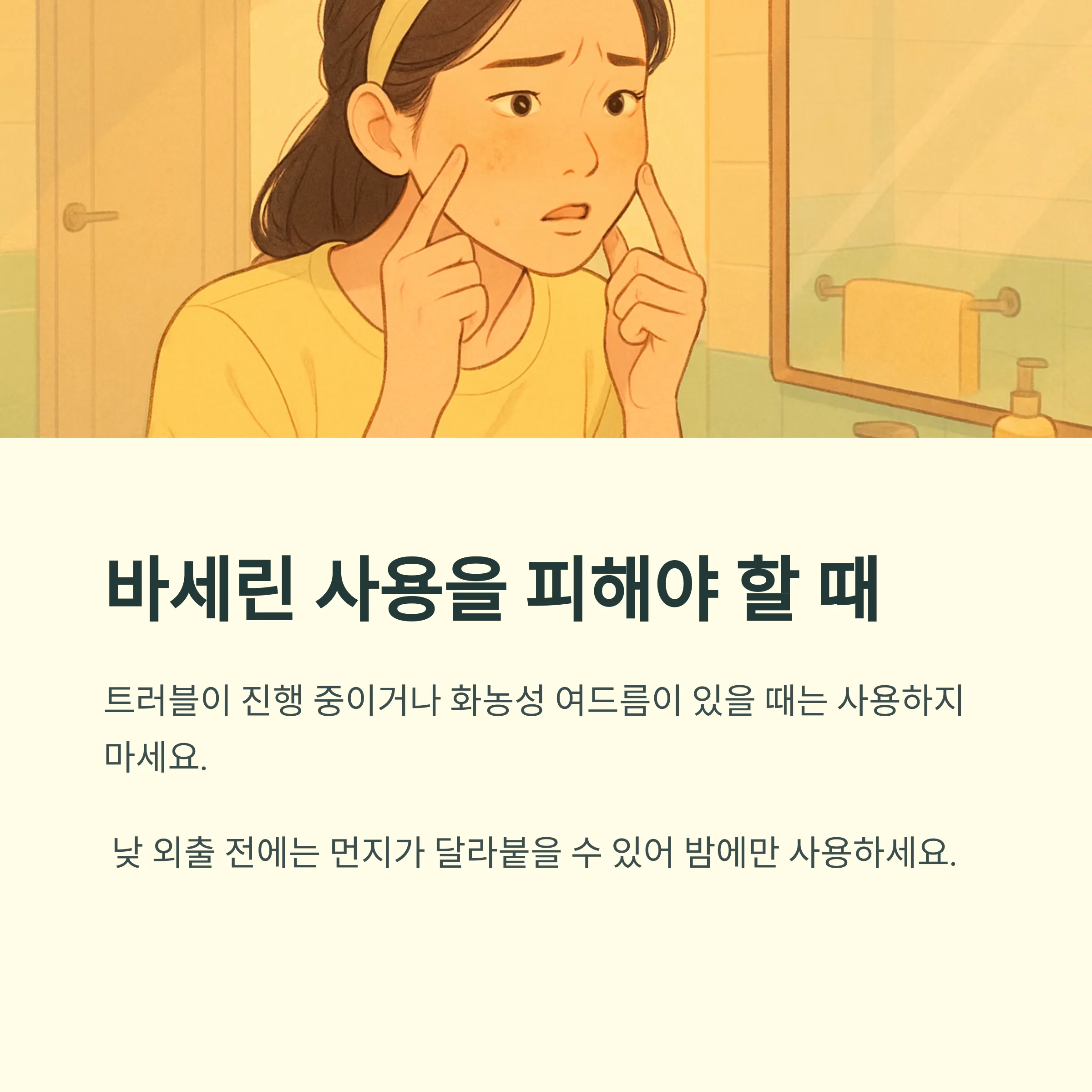 피부에 트러블이 이미 진행 중일 때나 화농성 여드름이 있는 경우에는 바세린 사용을 피해야 합니다.