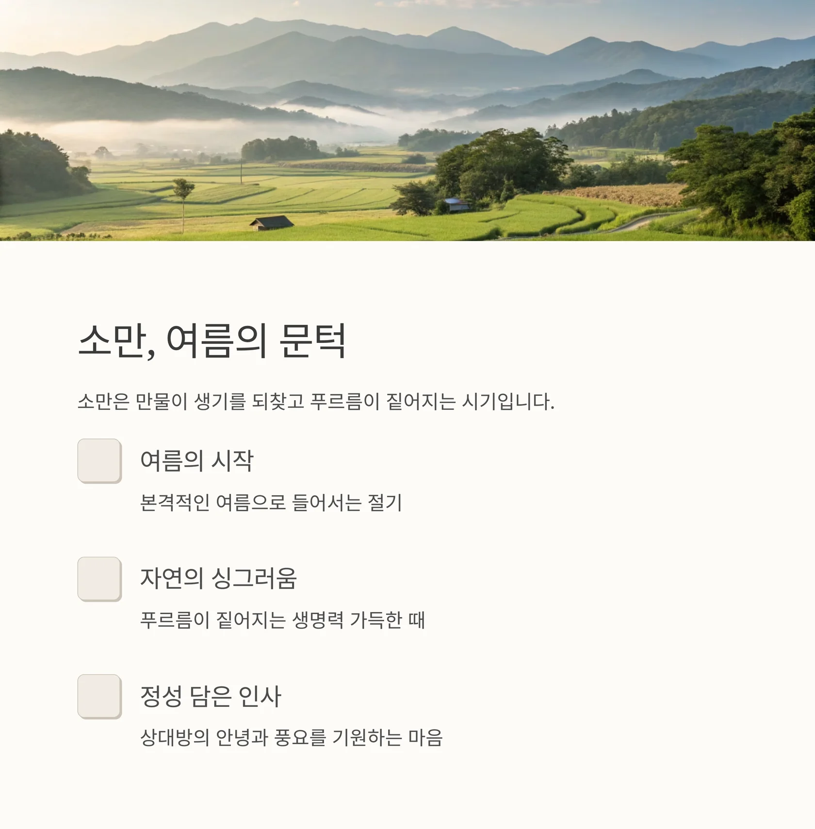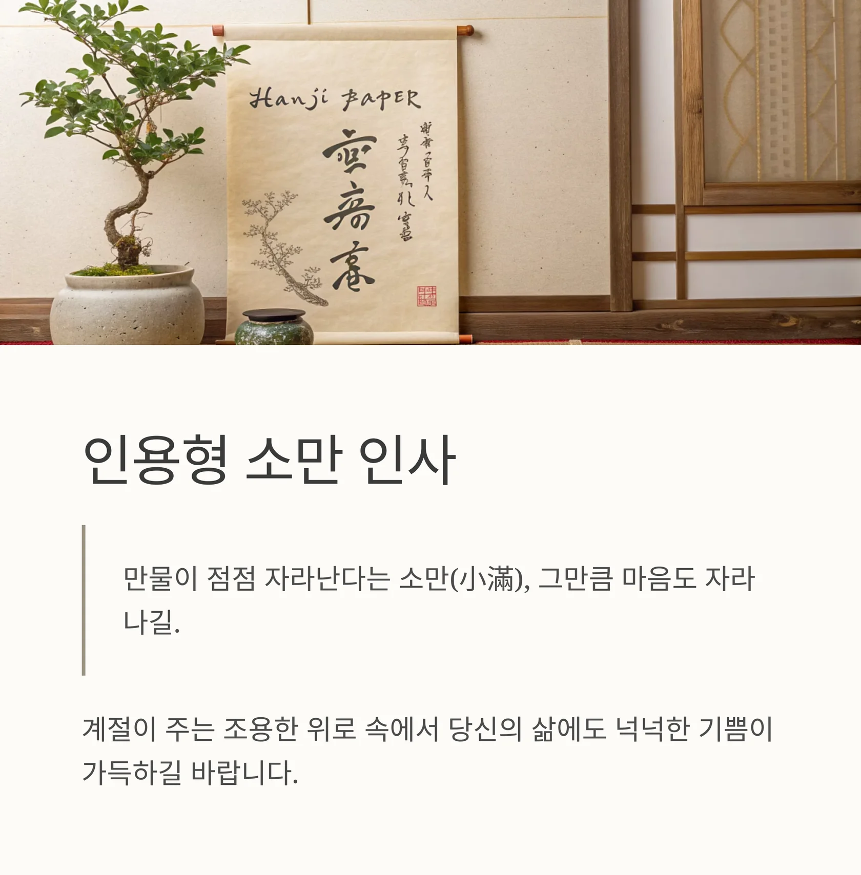 A: 소만은 초여름이 시작되는 절기이므로, 햇살, 초록, 생기, 풍요 같은 표현을 넣는 것이 좋습니다.