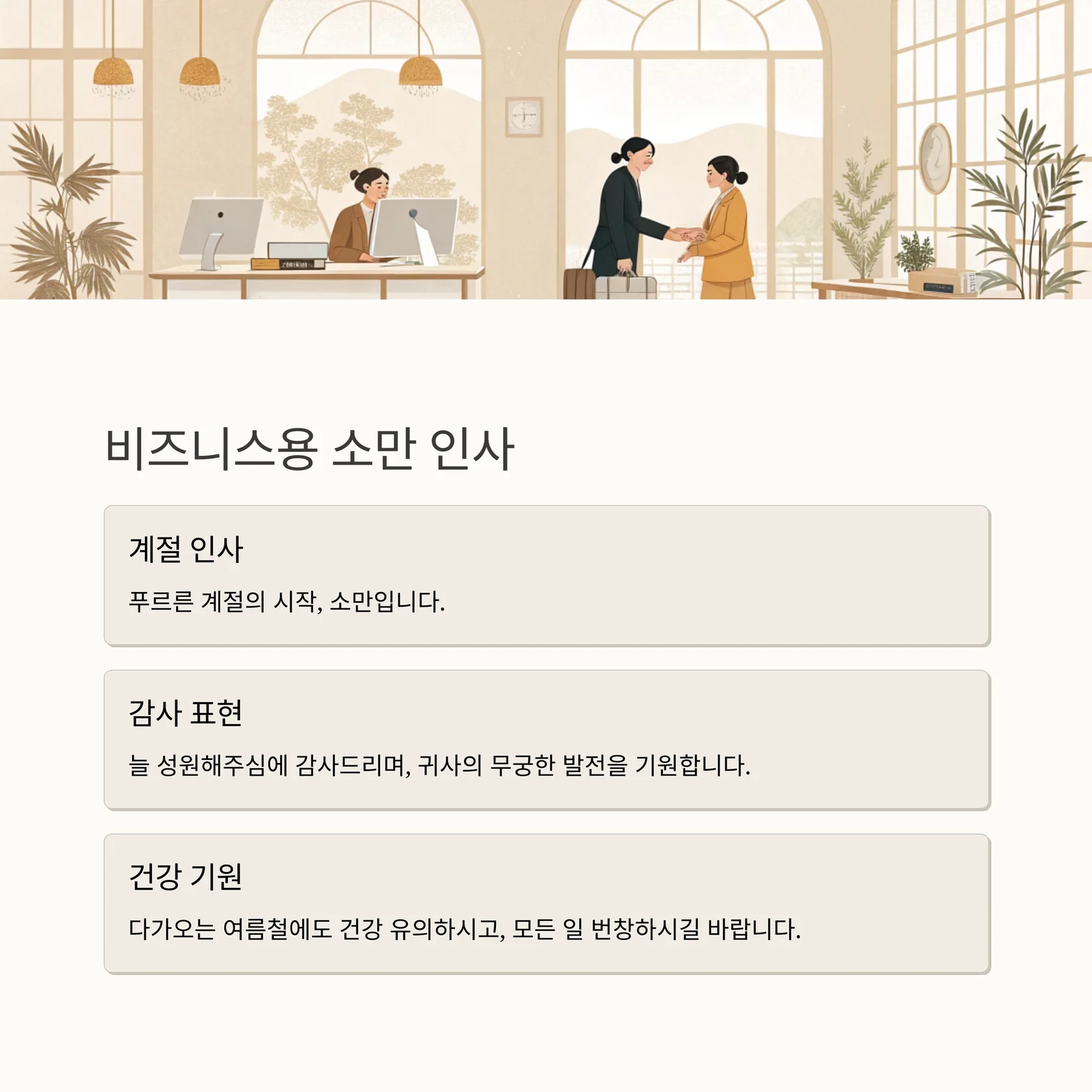 "다가오는 여름철에도 건강 유의하시고, 모든 일 번창하시길 바랍니다."