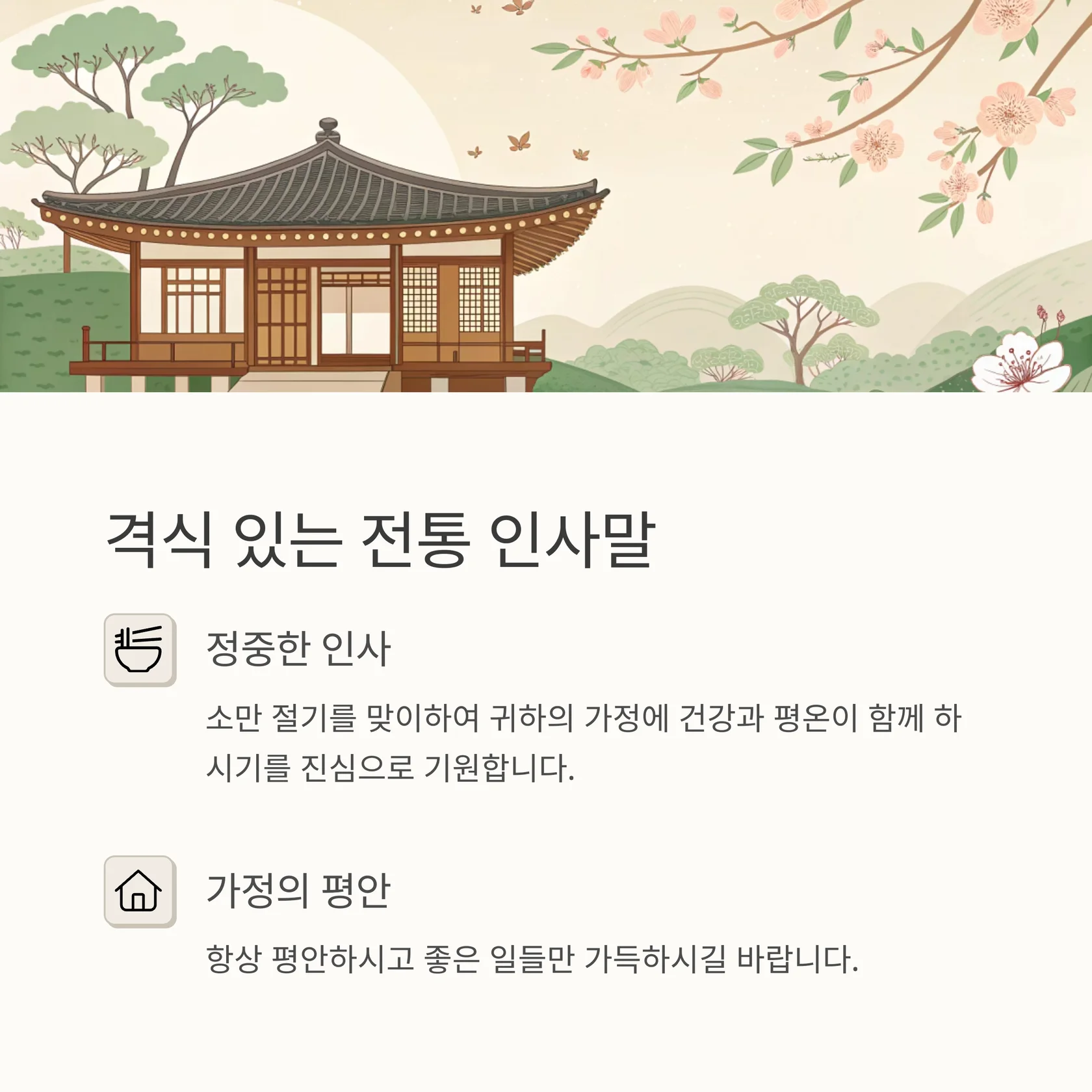 | 정중한 인사 | 격식 있고 공손한 어투 | 귀하의 건강과 행복을 진심으로 기원합니다 |
