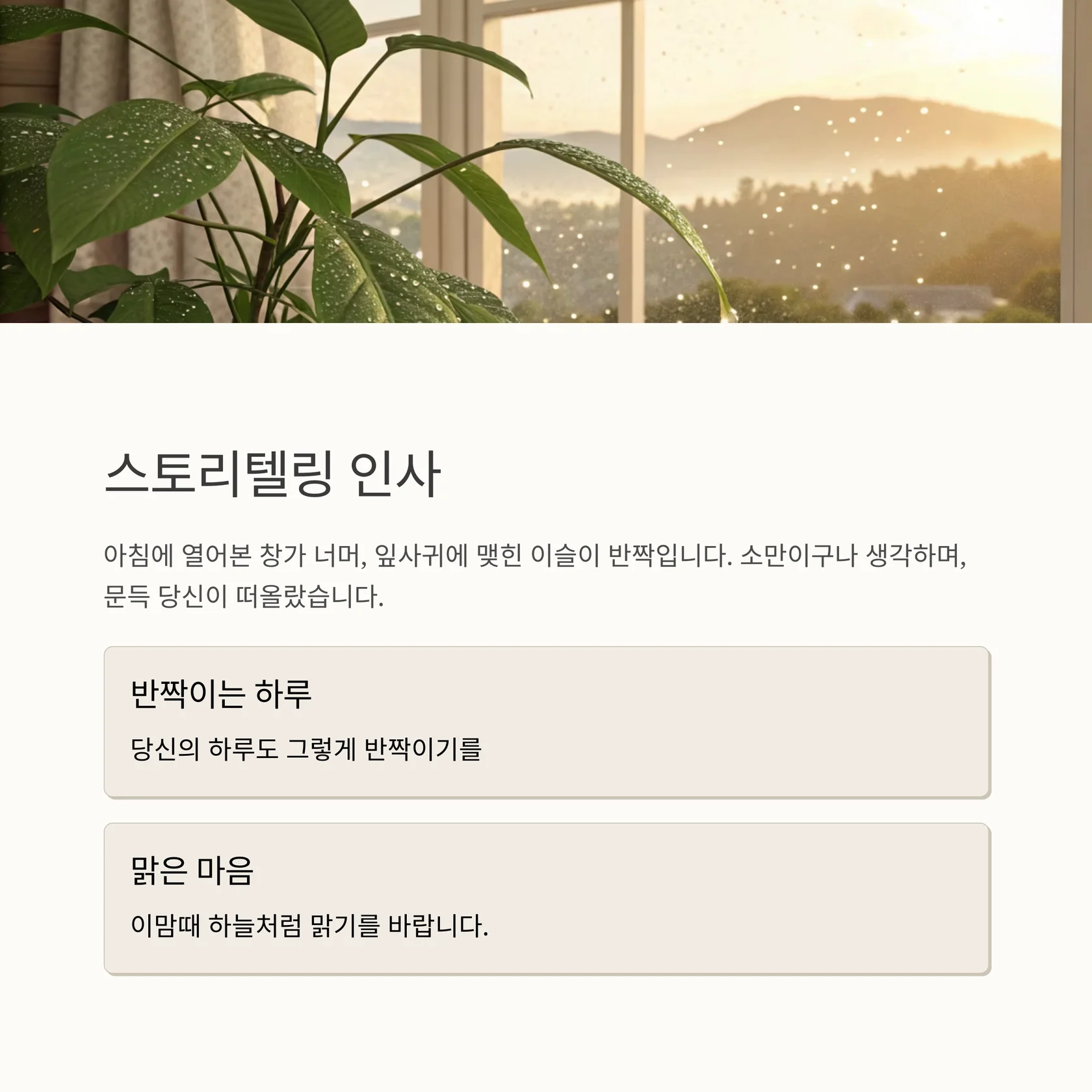 | 일상 대화형 | 편안하고 자연스러운 톤 | 소만이에요. 햇살처럼 따뜻한 하루 보내세요 |