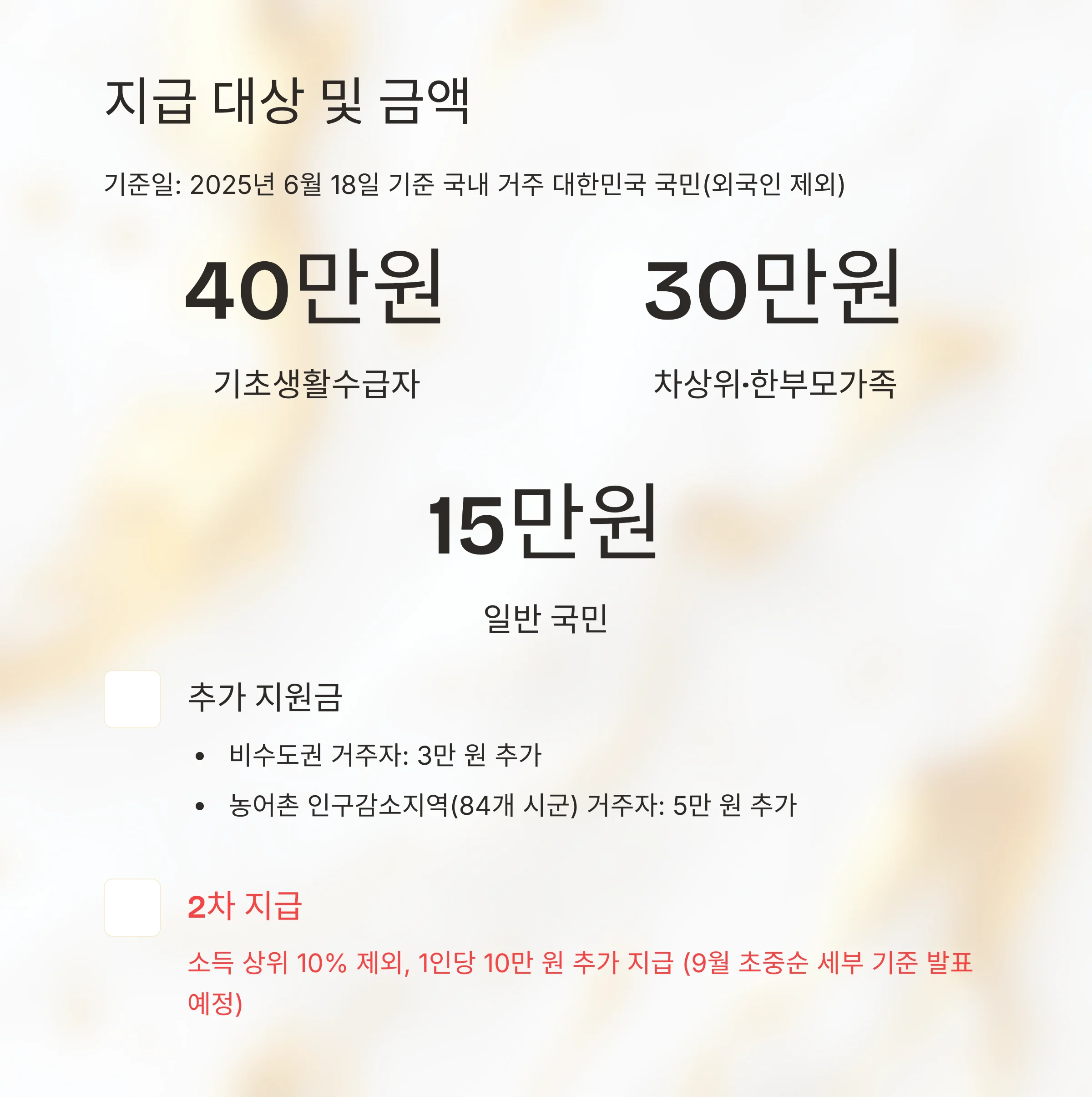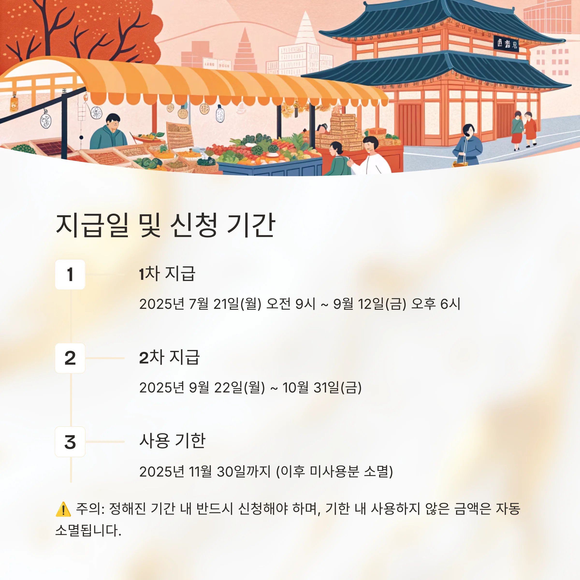 - 1차 지급: 2025년 7월 21일(월) 오전 9시 ~ 9월 12일(금) 오후 6시