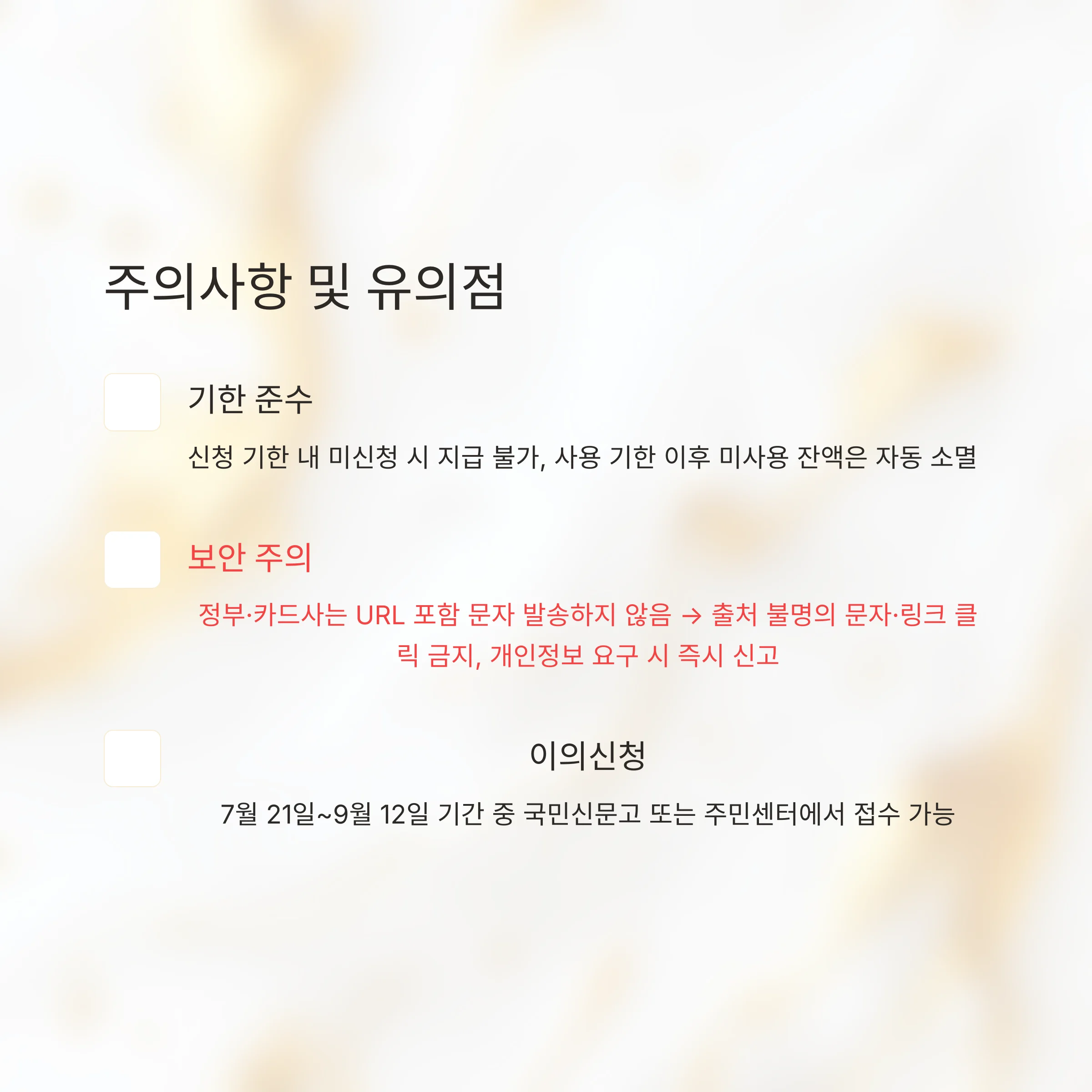 → 출처 불명의 문자·링크 클릭 금지, 개인정보 요구 시 즉시 신고 - 이의신청: 7월 21일~9월 12일 국민신문고 또는 주민센터에서 접수 가능
