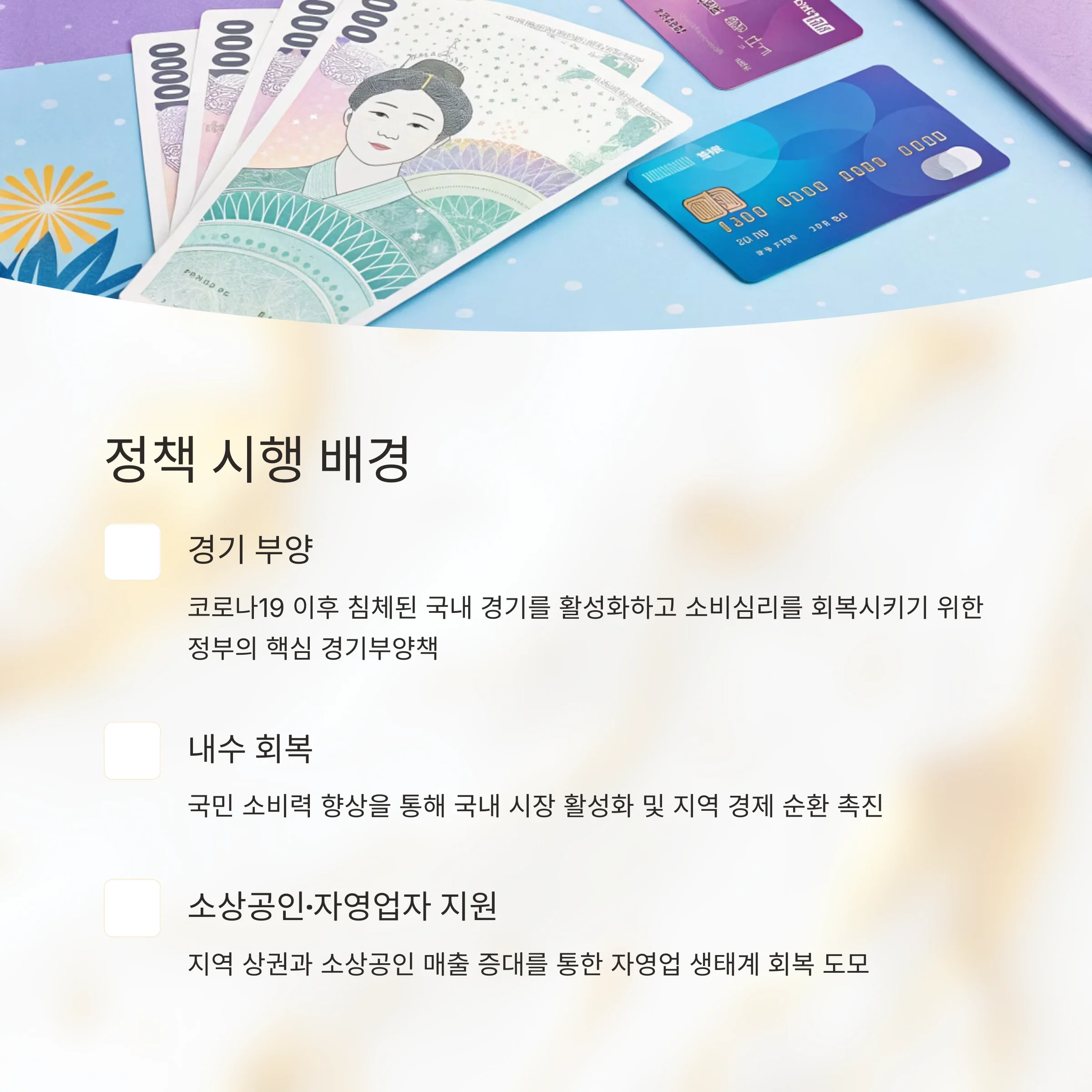 - 제한 업종: 대형마트, 백화점, 프랜차이즈 직영점, 온라인 쇼핑, 배달앱, 유흥업소 등 사용 불가