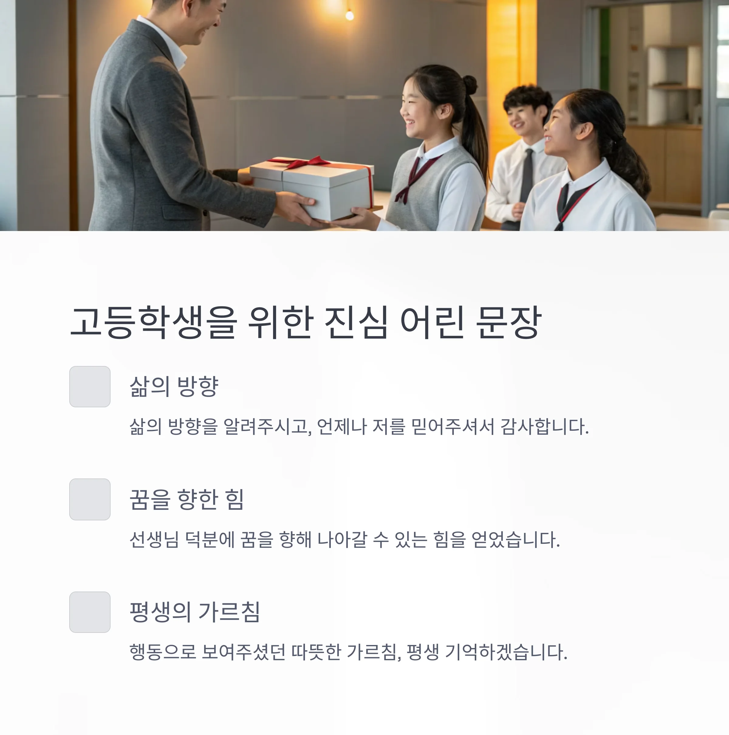 | 교실에서 직접 전달 | "선생님, 오늘 하루도 고맙습니다!" |