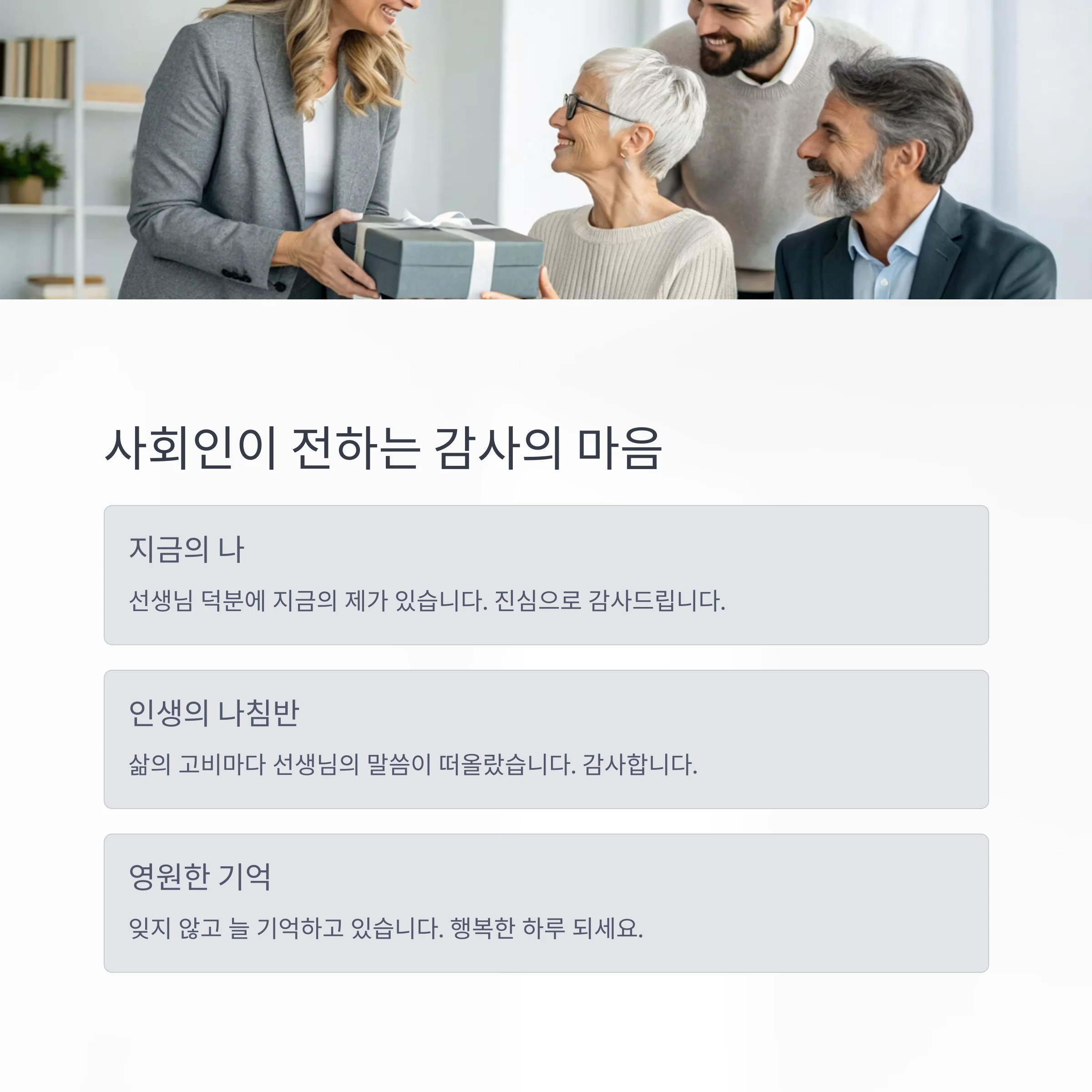 | 진심 깊은 존경 | "삶의 나침반이 되어주셨습니다." | 사회인 제자 |