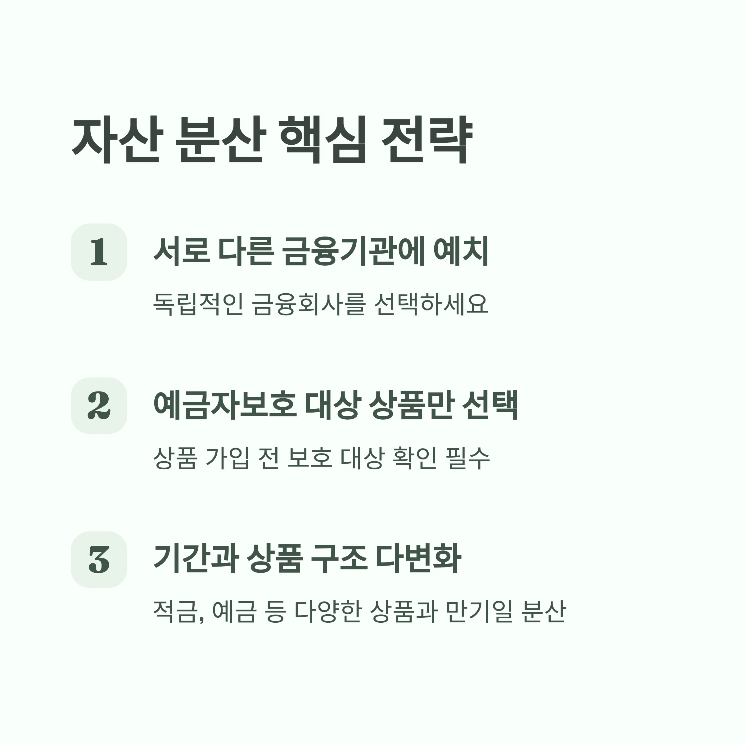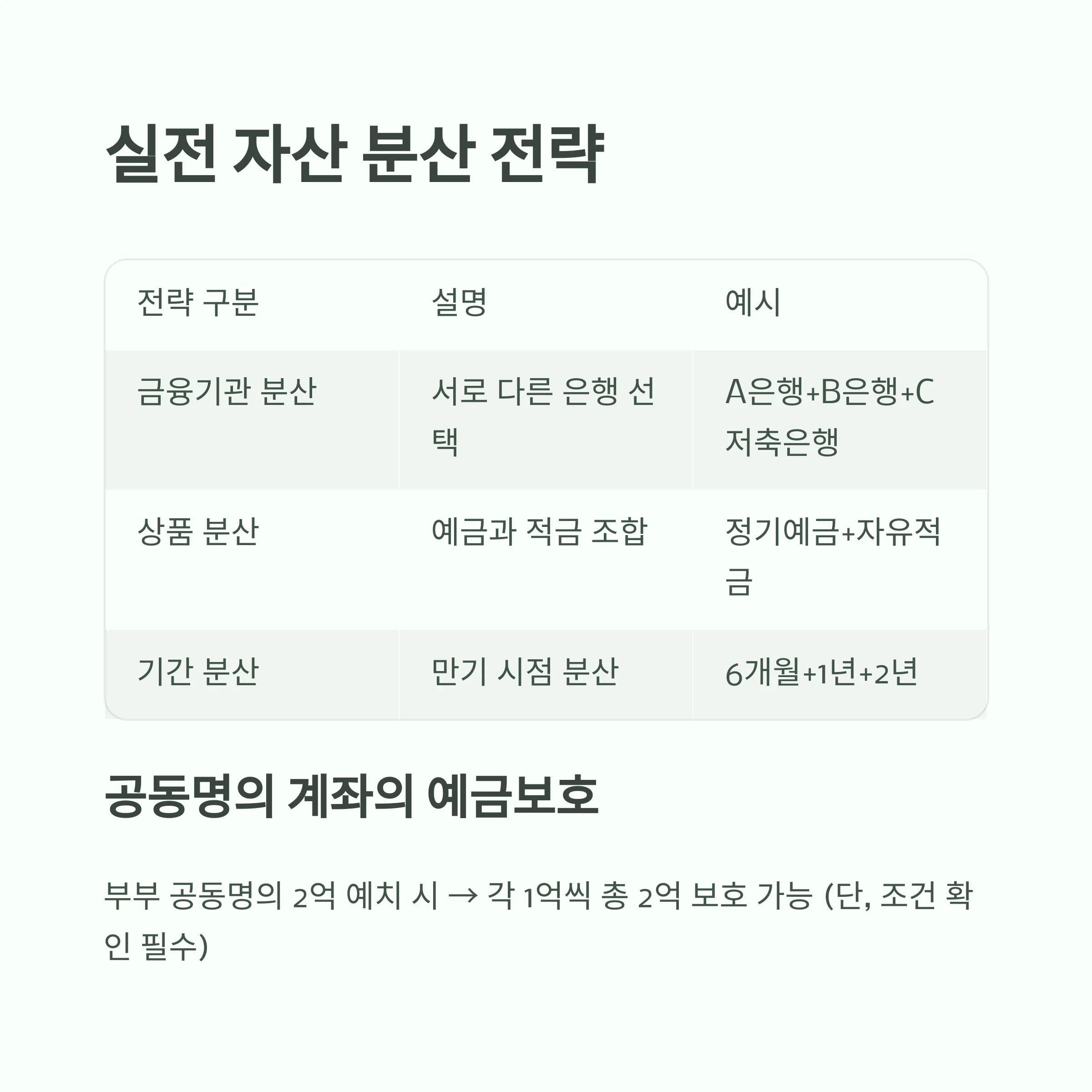| 금융기관 분산 | 서로 다른 은행 선택 | A은행+B은행+C저축은행 |