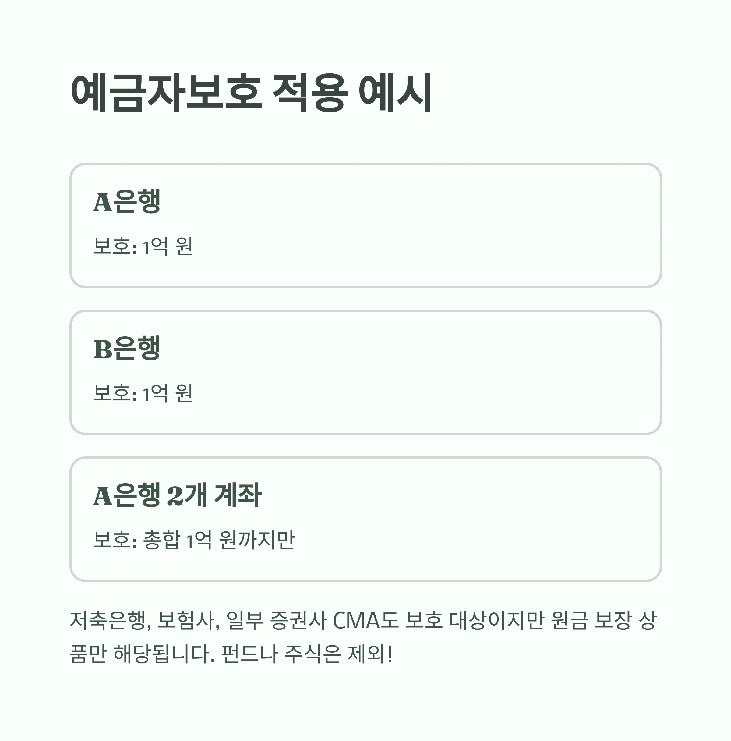 | A은행 2개 계좌 | 보호 | 총합 1억 원까지만 |
