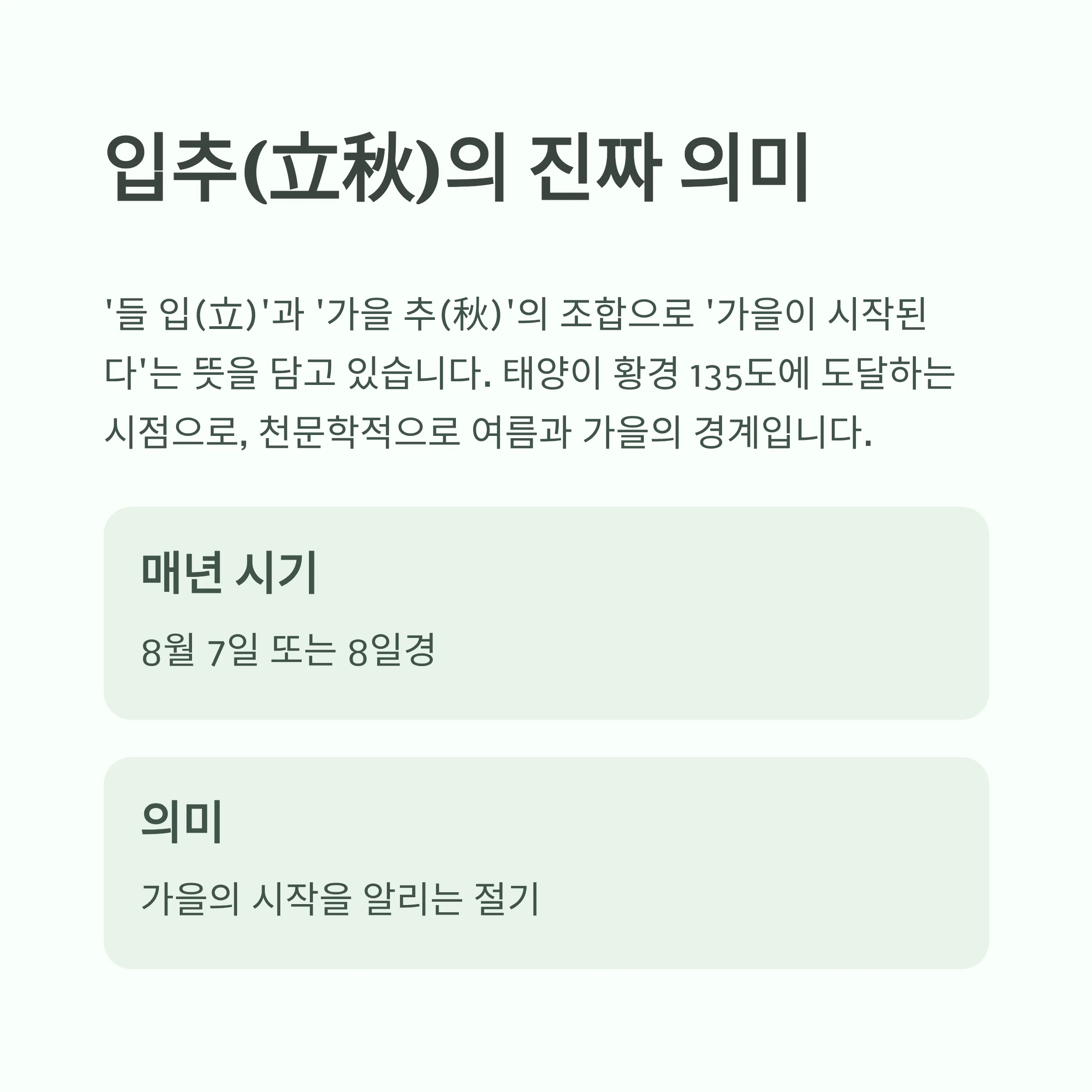 입추는 ‘들 입(立)’과 ‘가을 추(秋)’의 조합으로 ‘가을이 시작된다’는 뜻을 담고 있습니다.