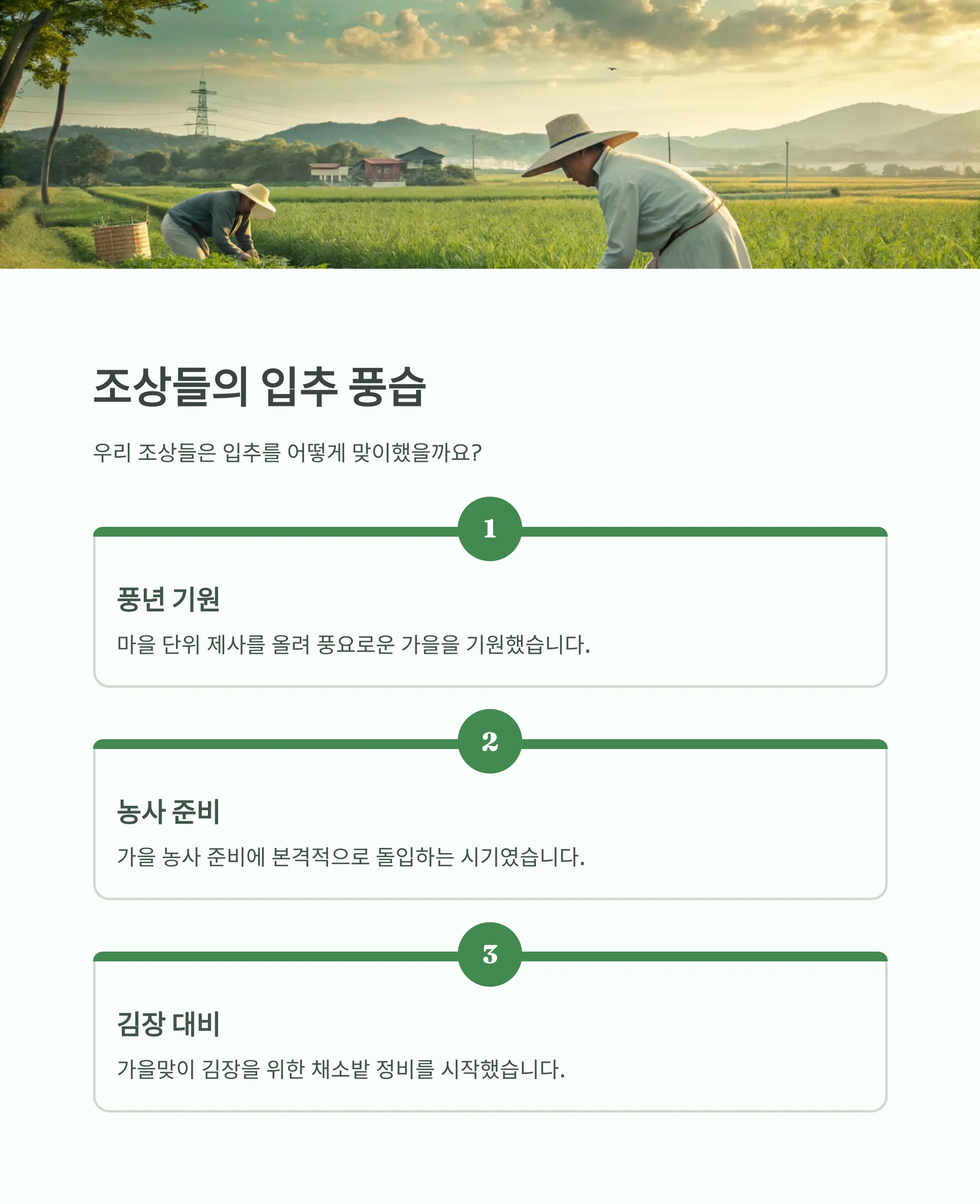 또한, 입추가 지나면 가을맞이 김장을 위한 채소밭 정비를 시작하는 경우도 많았습니다.