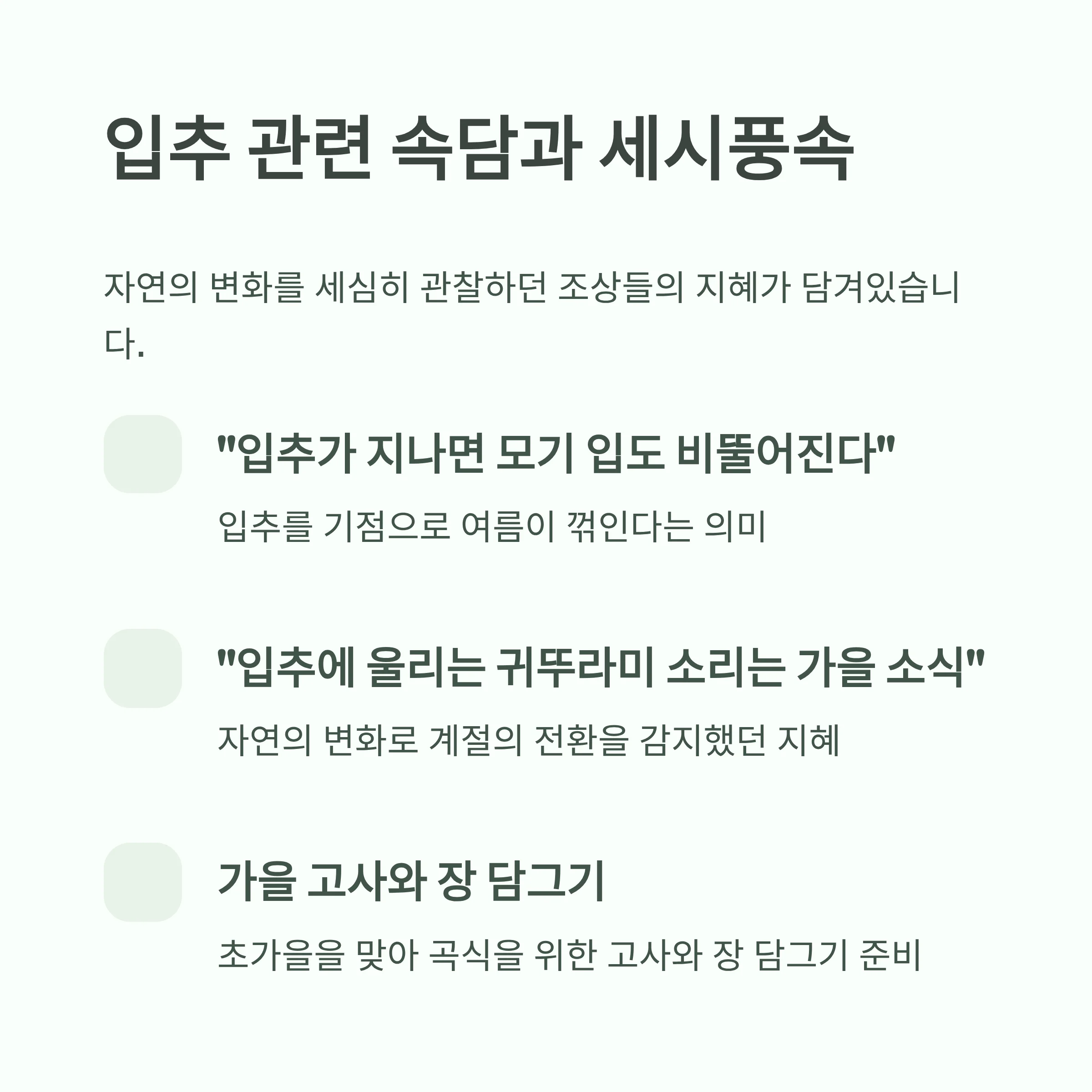 "입추가 지나면 모기 입도 비뚤어진다"는 말은 입추를 기점으로 여름이 꺾인다는 의미를 담고 있으며, “입추에 울리는 귀뚜라미 소리는 가을 소식”이라 하여 자연의 변화에 예민하게 반응하던 모습을 보여줍니다.