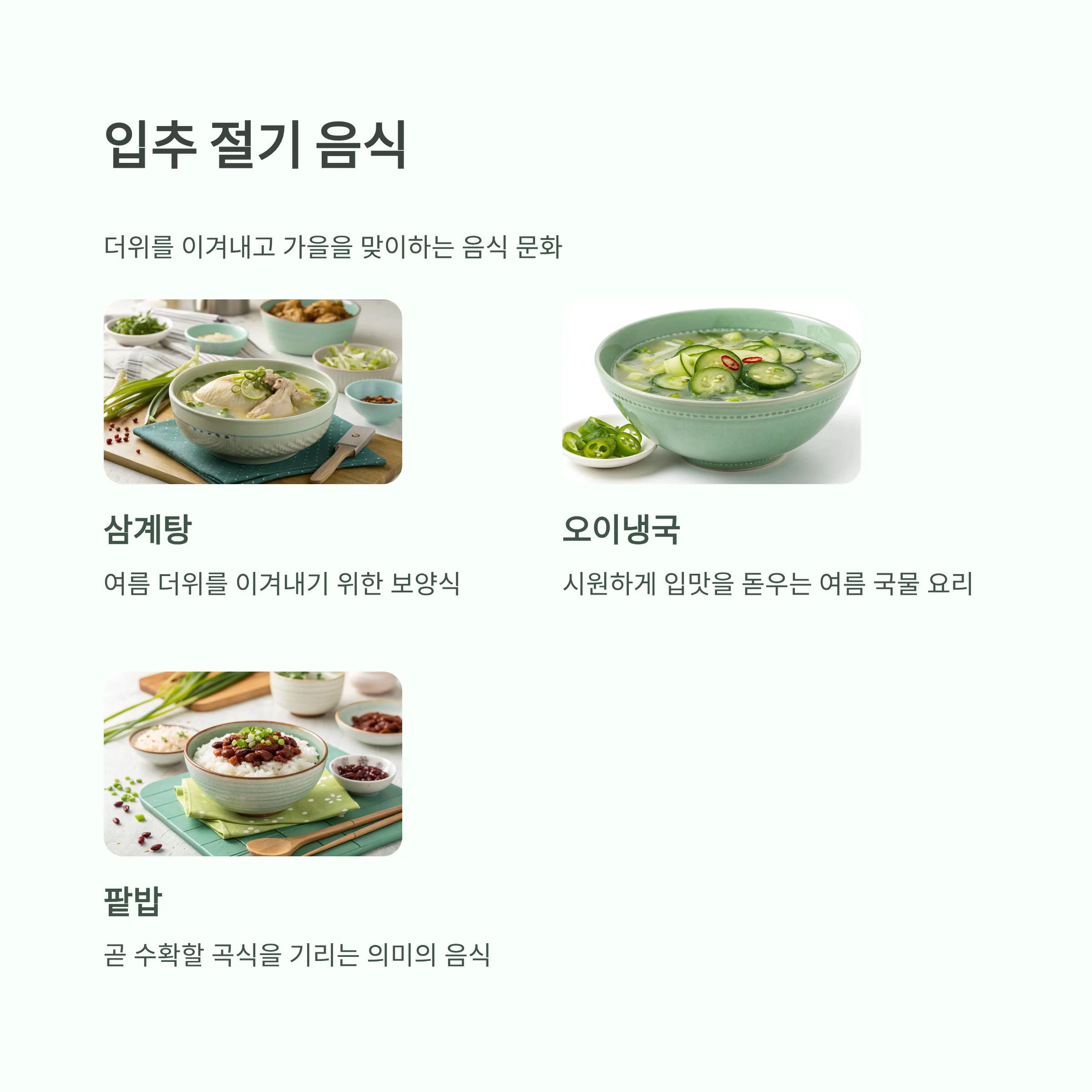 입추에는 특별한 음식이 정해져 있지는 않지만, 이 시기를 전후해 복날 음식과 겹치기도 하며 더위를 달래기 위한 삼계탕, 오이냉국, 육회 등의 보양식을 즐기는 경우가 많습니다.