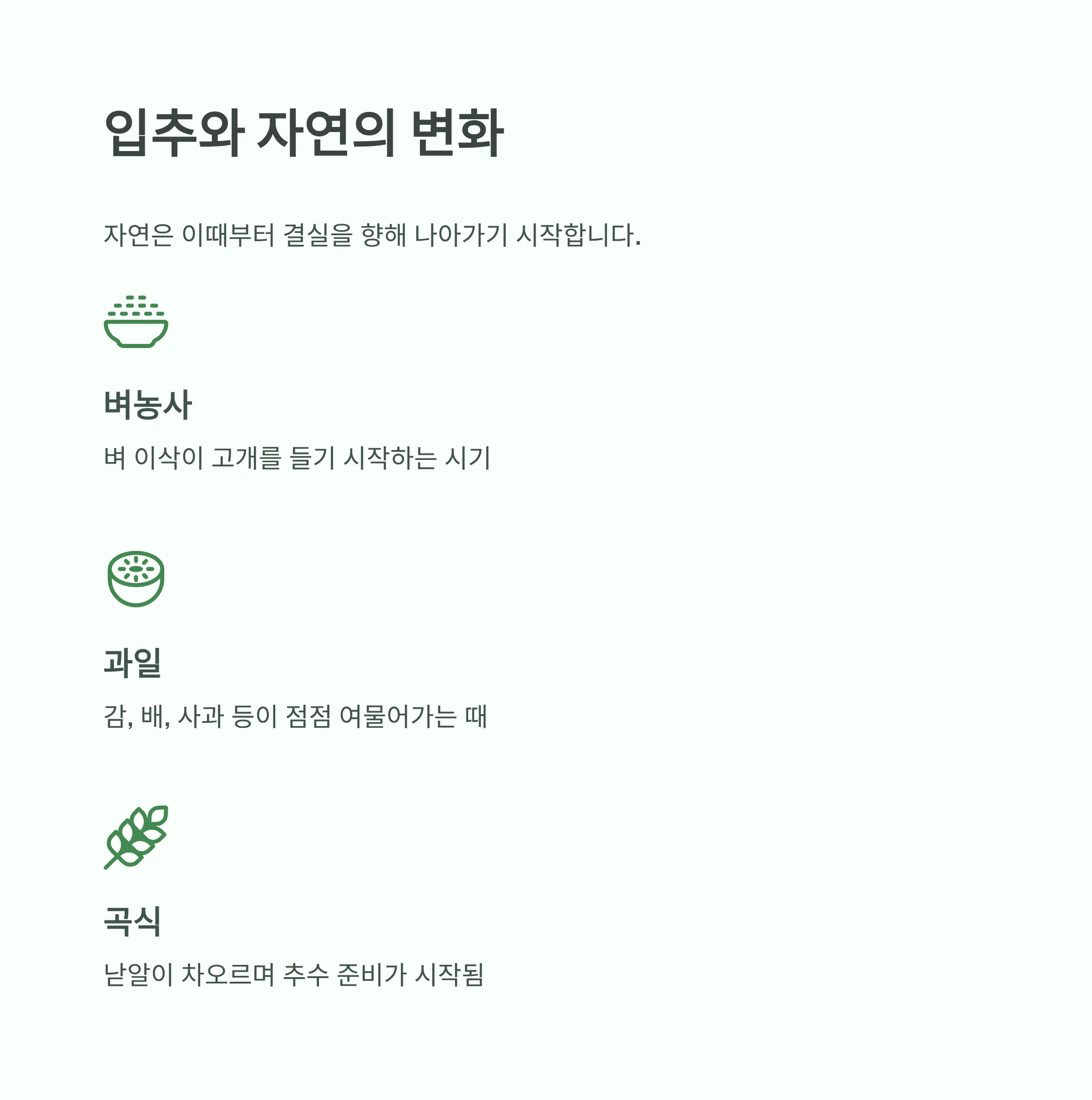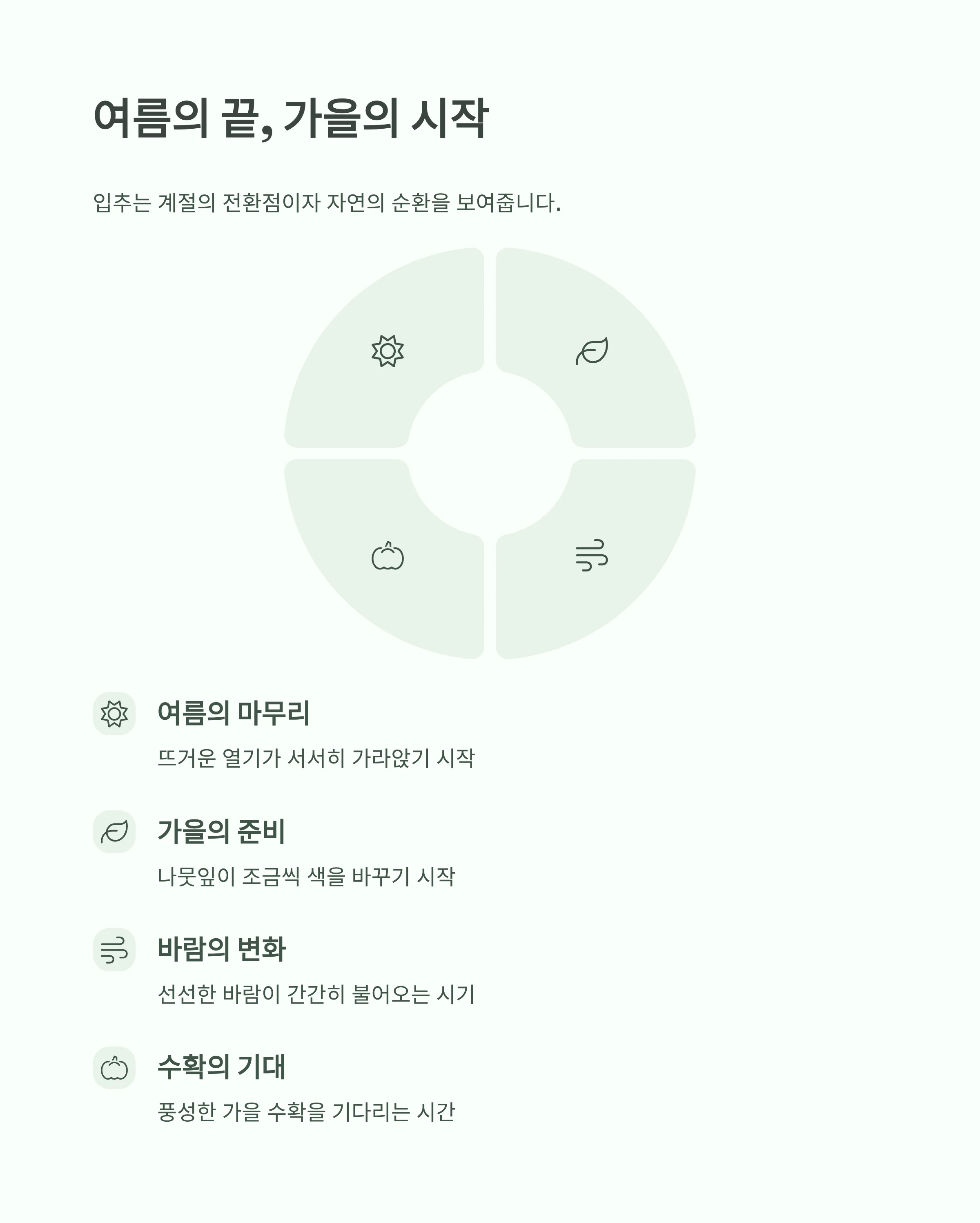 입추부터는 가을 농사 준비가 본격화되며 벼 이삭이 고개를 들고, 감·배·사과 등의 과일이 점점 여물어가는 시기입니다.