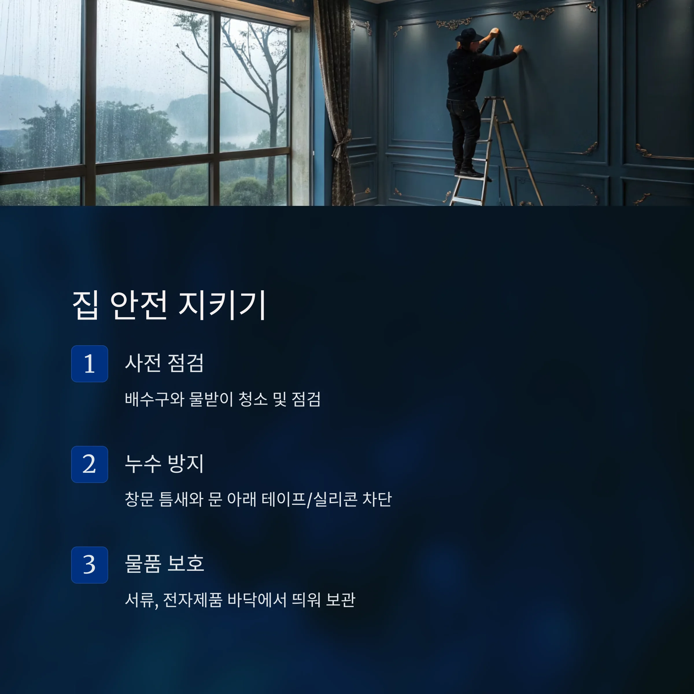 창문 틈새와 문 아래로 물이 새지 않도록 테이프나 실리콘으로 차단하고 서류, 전자제품은 바닥에서 띄워 보관하는 것이 중요합니다.