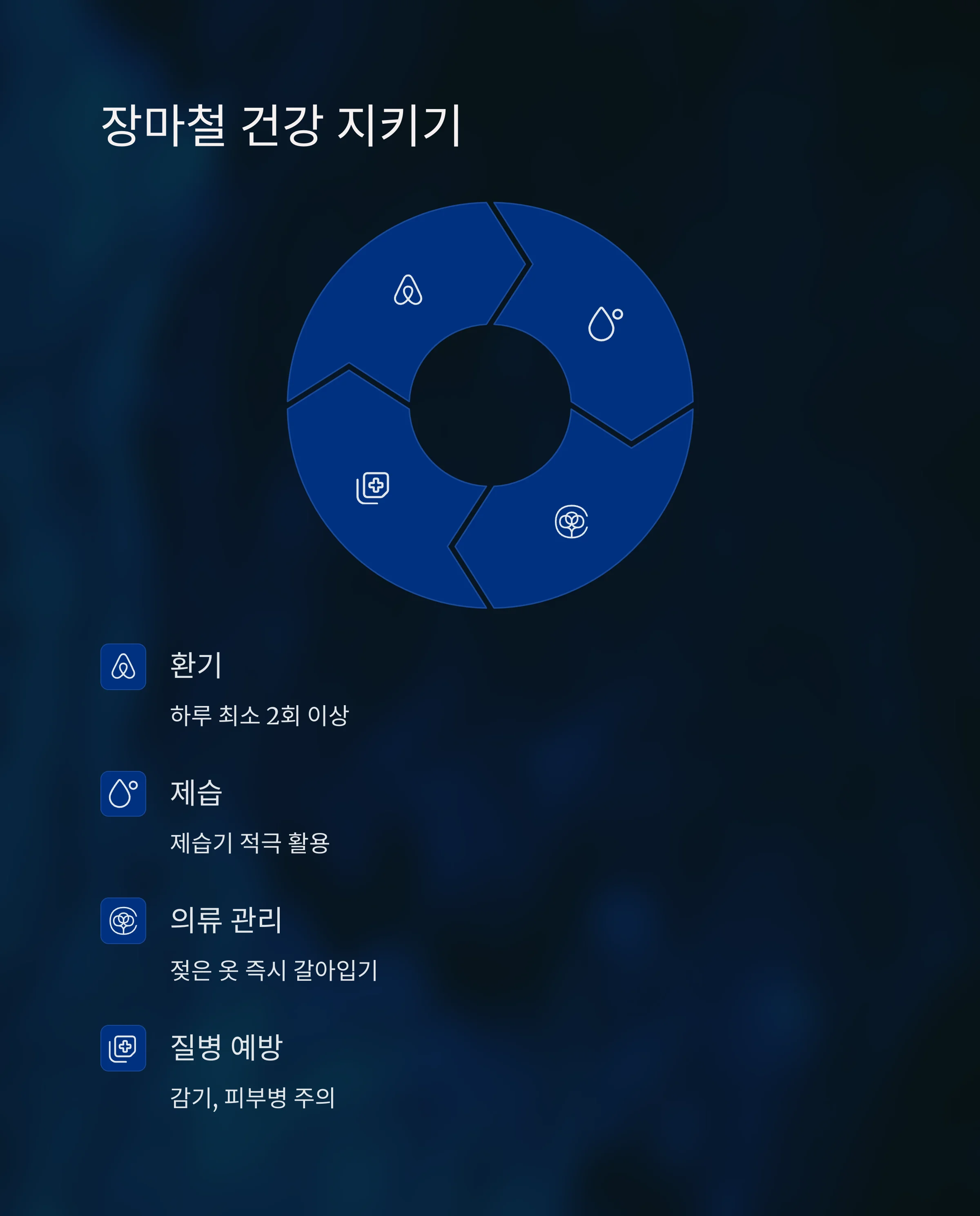 젖은 옷은 즉시 갈아입고, 면역력이 약한 분들은 감기나 피부병 예방에 유의하세요.