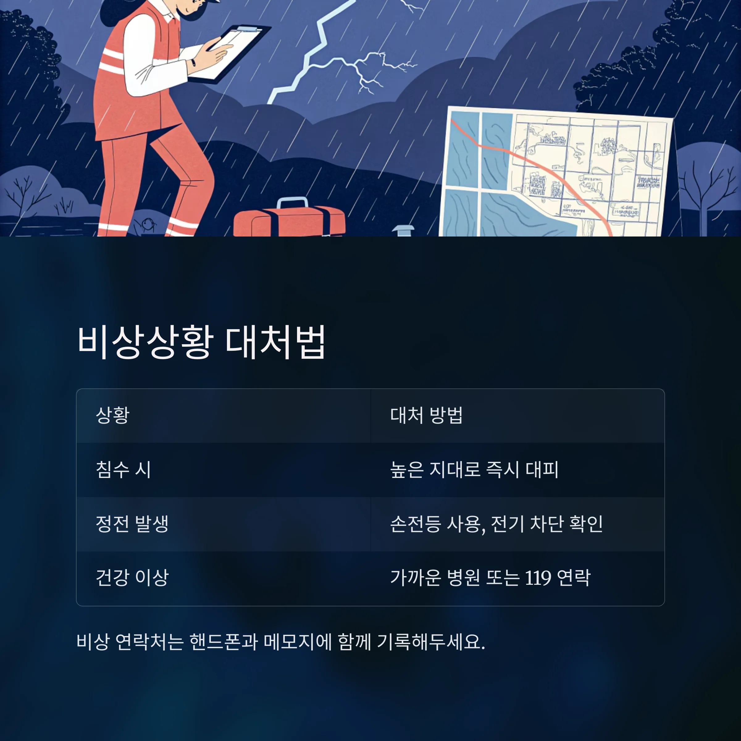 비상 연락처는 핸드폰과 메모지에 함께 기록해 두고 가까운 대피소 위치를 미리 파악해 두는 것이 좋습니다.