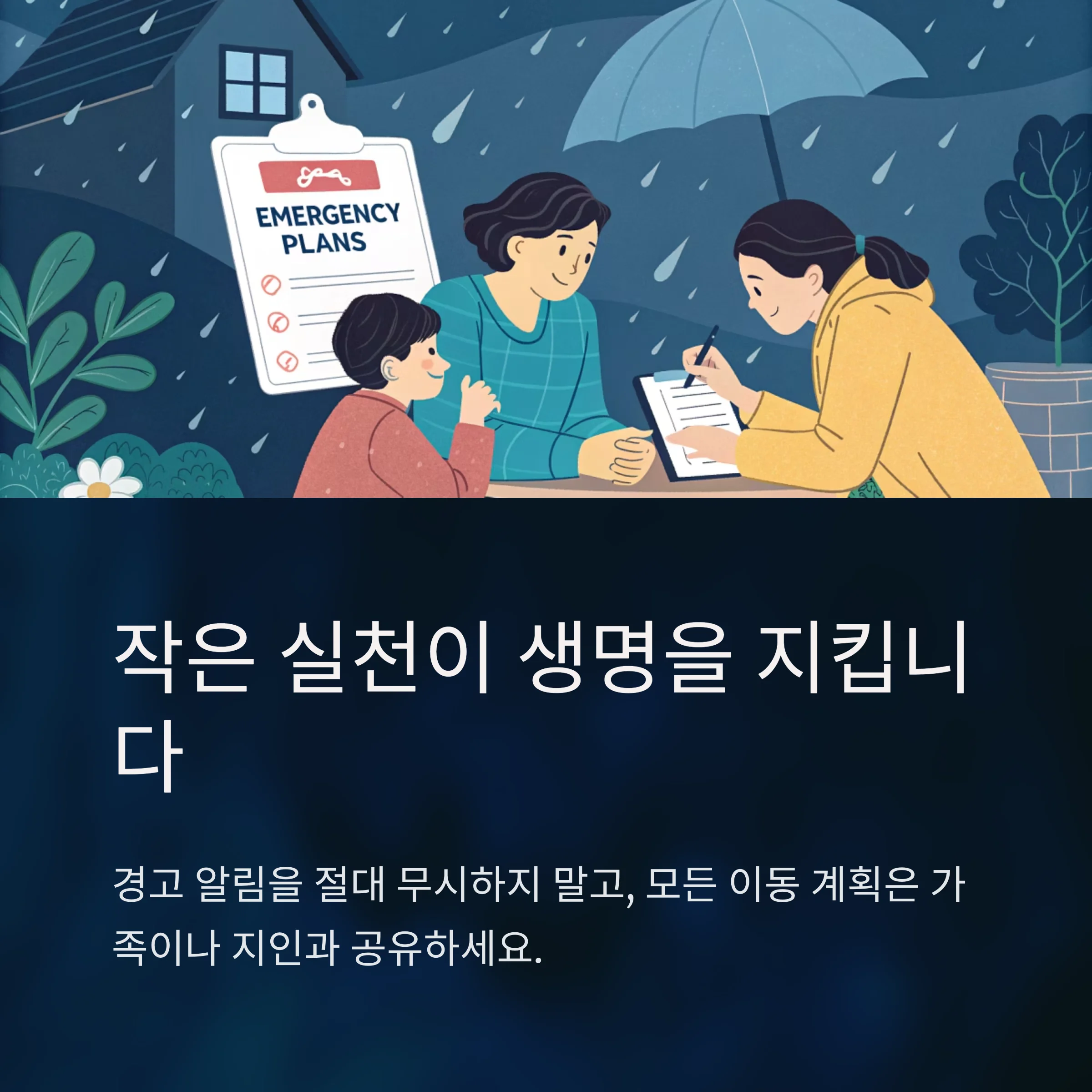 장마철에는 경고 알림을 절대 무시하지 말고, 모든 이동 계획은 가족이나 지인과 공유해 예기치 못한 사고를 막아야 합니다.