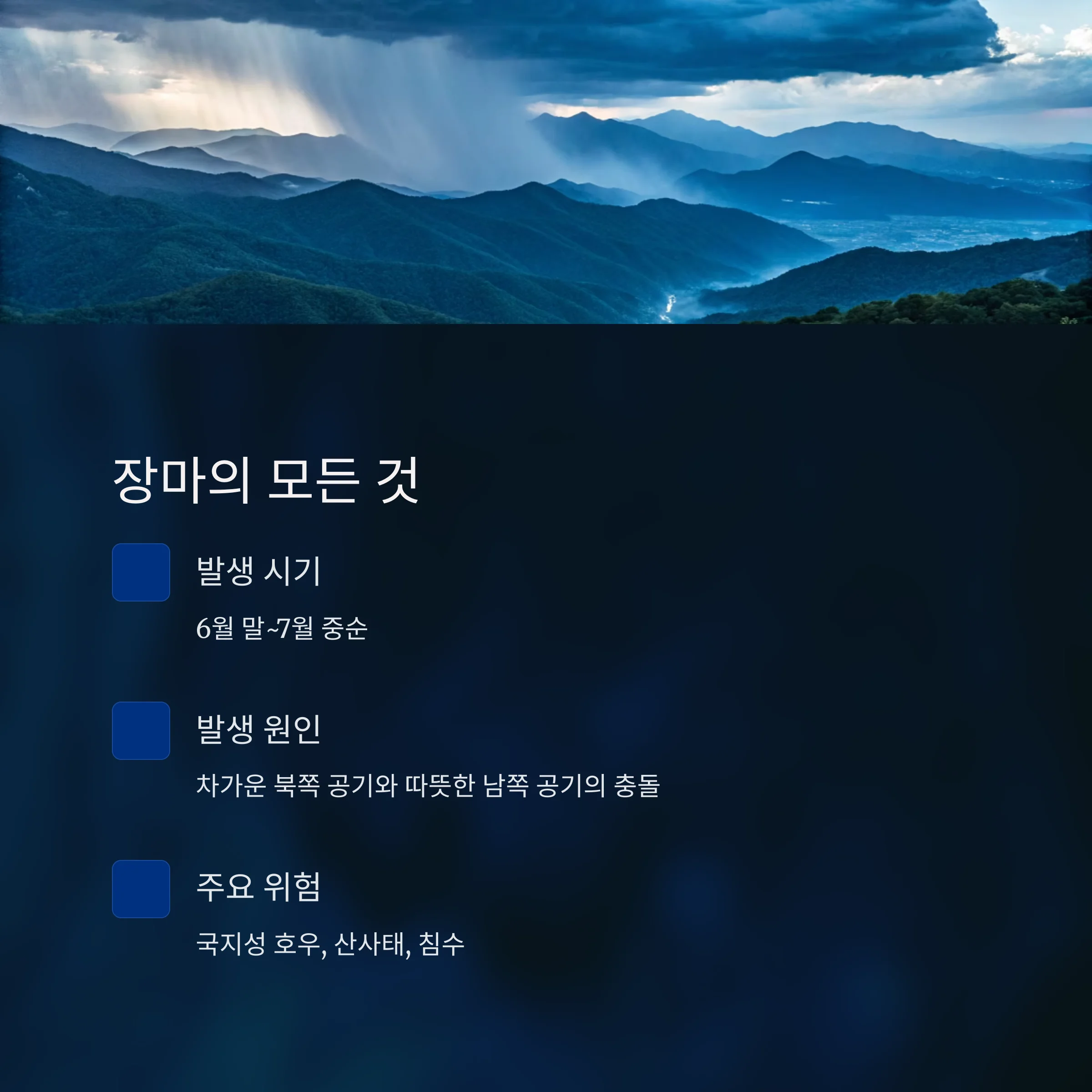 이 시기에는 갑작스러운 국지성 호우와 집중호우가 자주 발생하며, 산사태, 침수, 도로 통제가 일상적으로 일어날 수 있습니다.