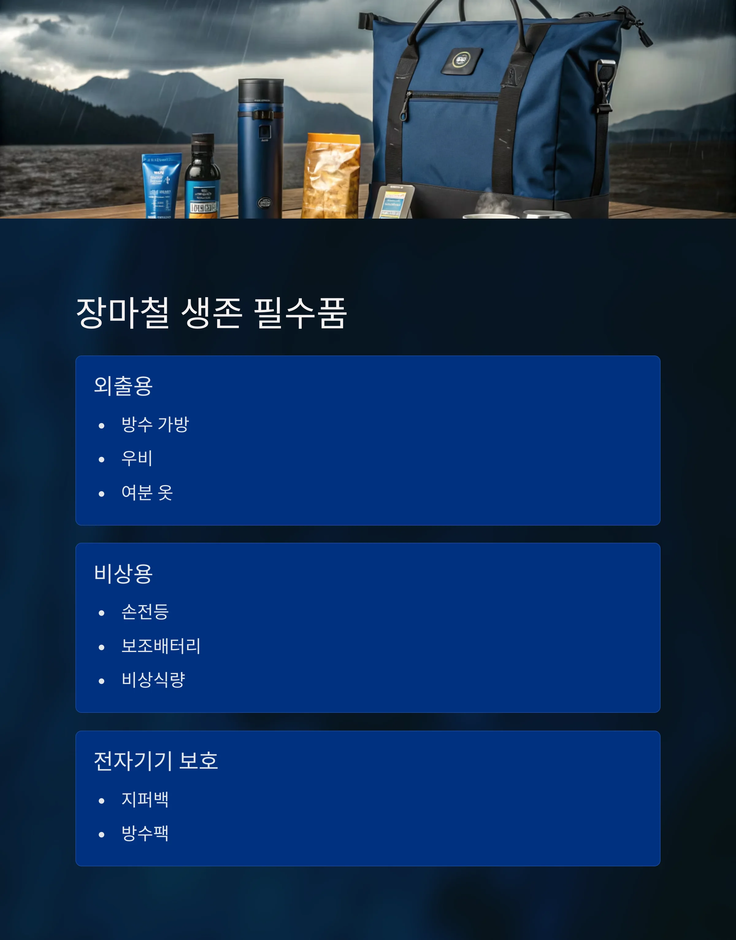 장마철에는 방수가 되는 가방, 여분의 옷, 우비, 비상식량, 물, 손전등, 보조배터리를 준비하는 것이 좋습니다.
