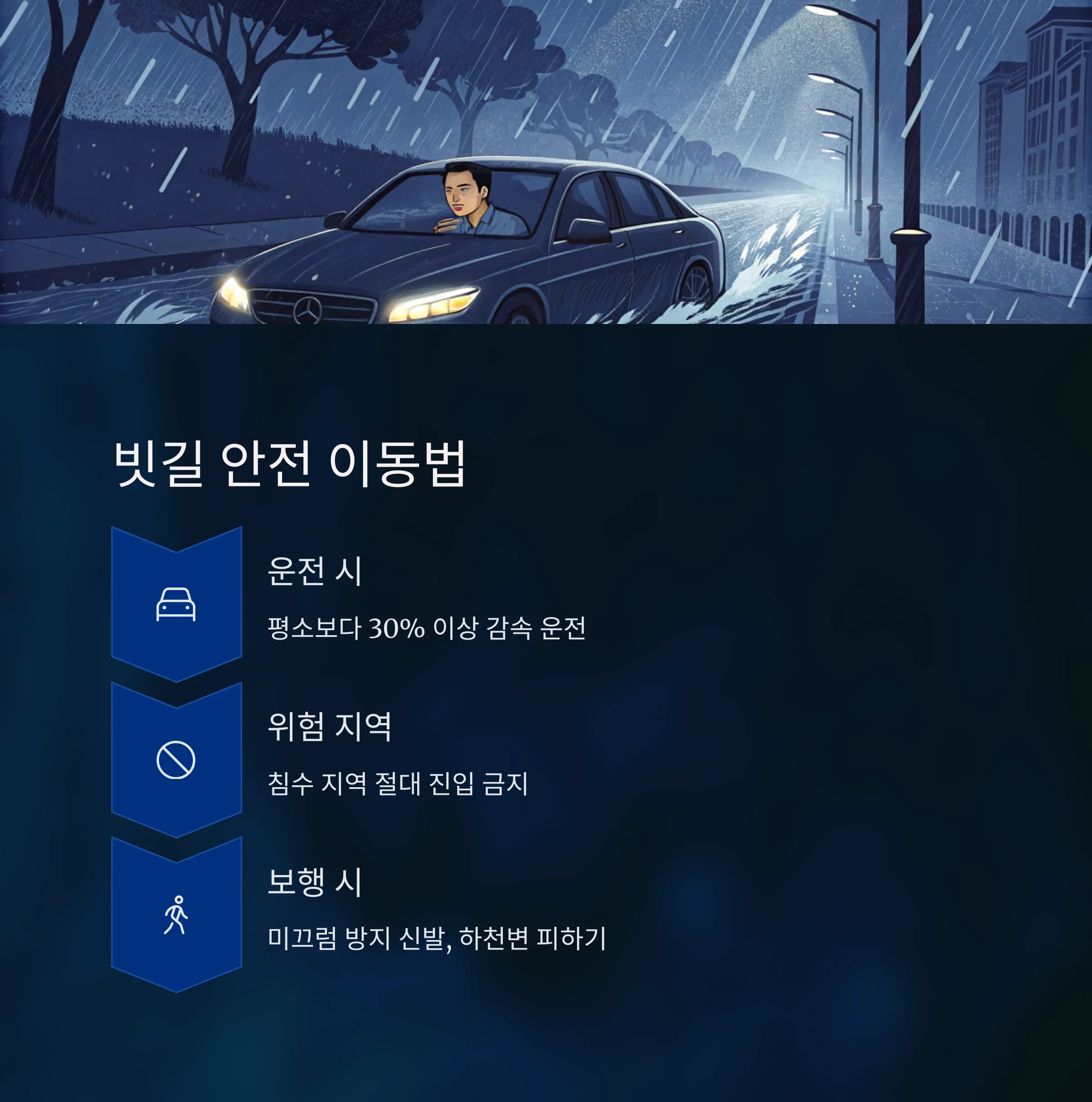 빗길에서는 평소보다 30% 이상 감속 운전이 필수이며 도로가 보이지 않을 정도의 침수 지역은 절대 진입하지 마세요.