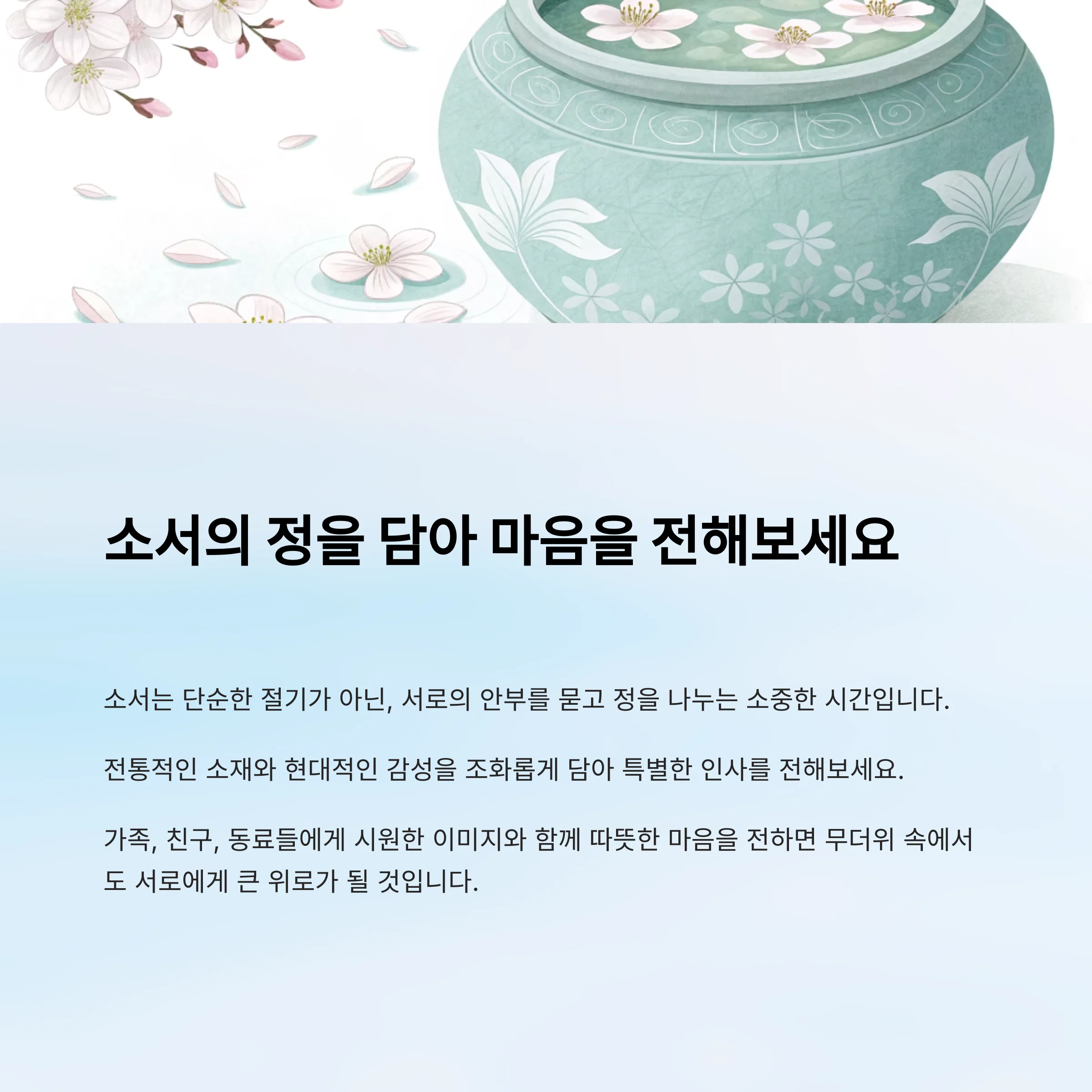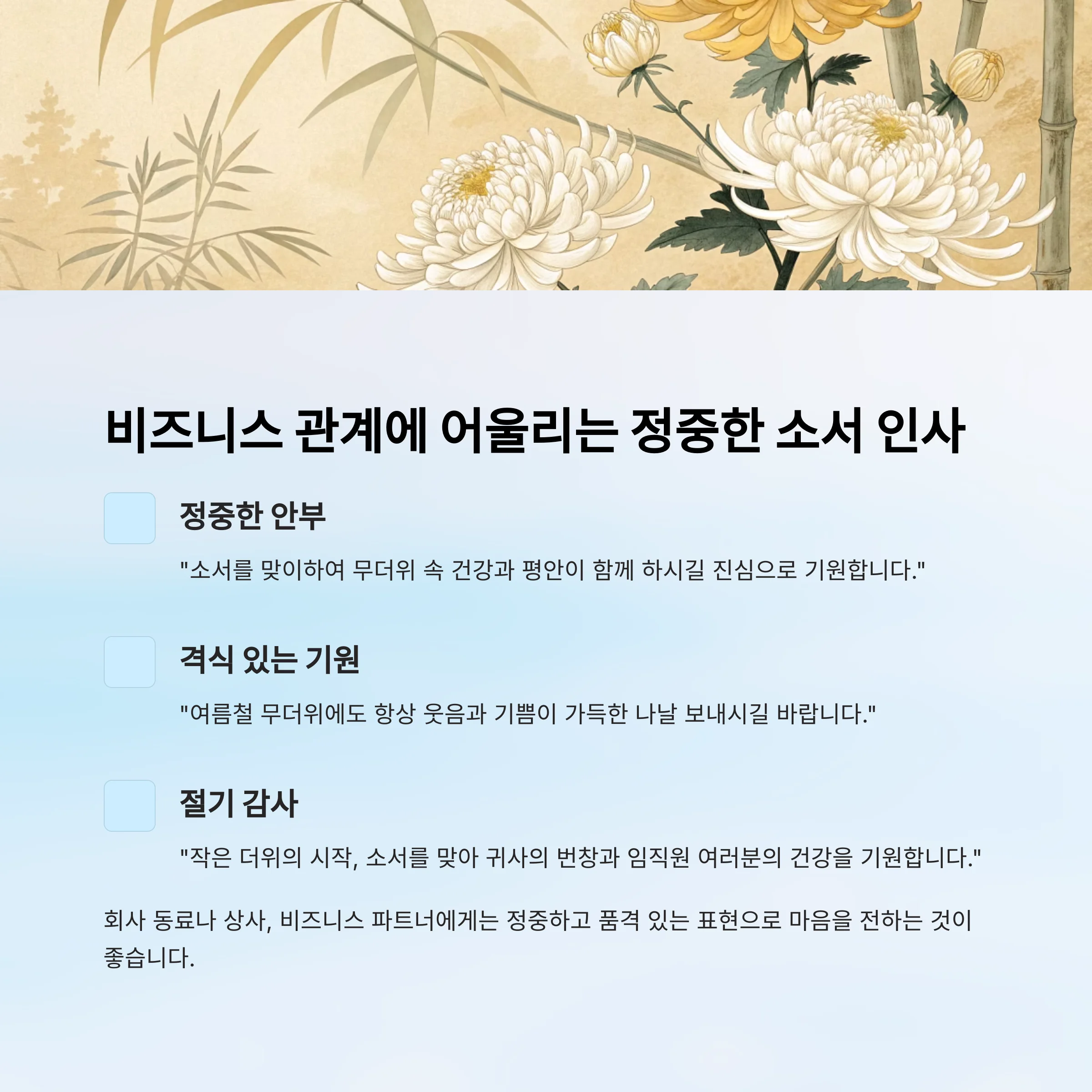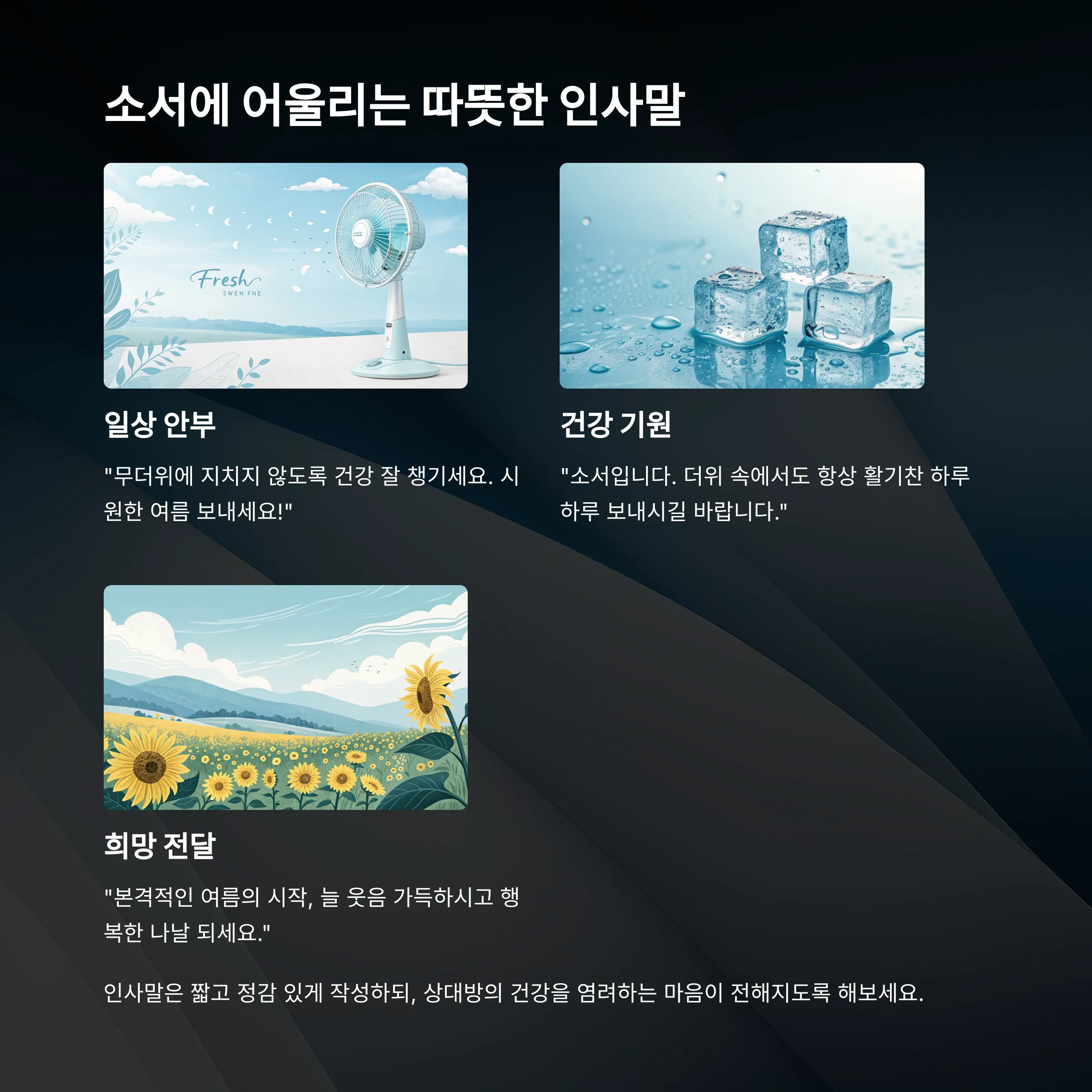 예를 들어 "소서 즈음하여 더위가 시작됩니다"와 같이 전통 어휘를 적절히 넣으면 감성적인 깊이가 더해집니다.