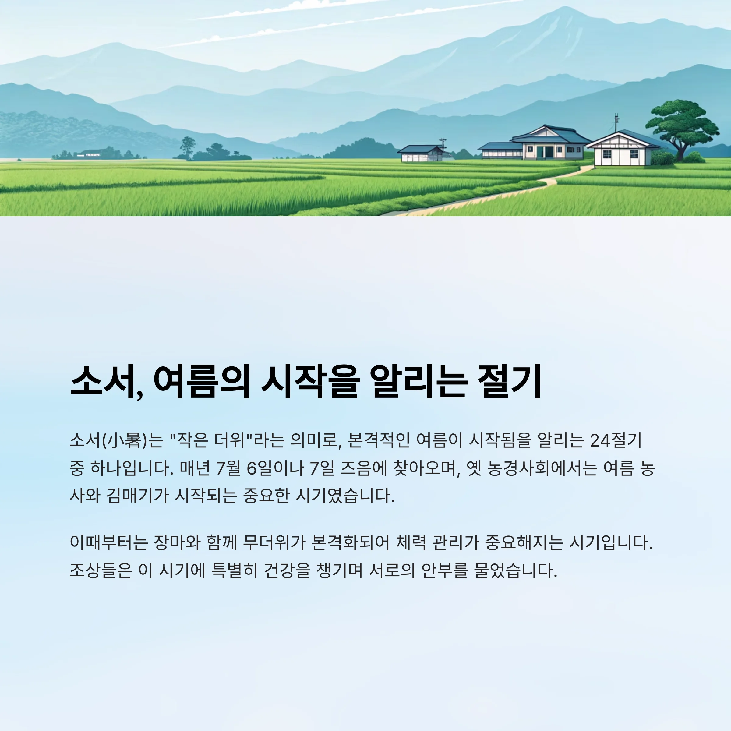 특히 인스타그램이나 블로그에는 "소서 풍경", "여름의 시작" 같은 해시태그와 함께 이미지 업로드 시 검색 노출 효과도 기대할 수 있습니다.