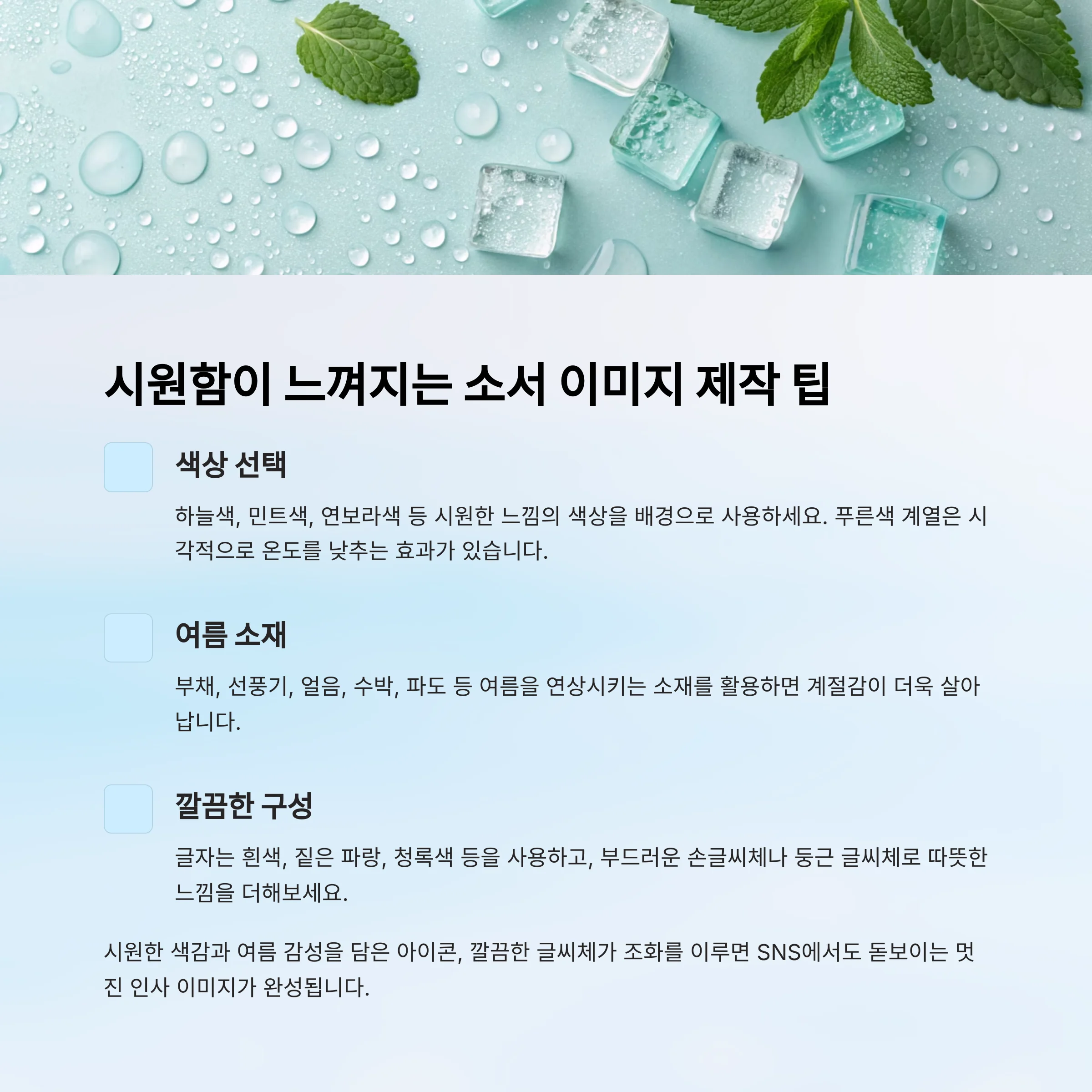 이미지는 수박, 파도, 아이스커피, 선풍기 등 여름 감성 아이콘을 활용하면 더욱 자연스럽습니다.
