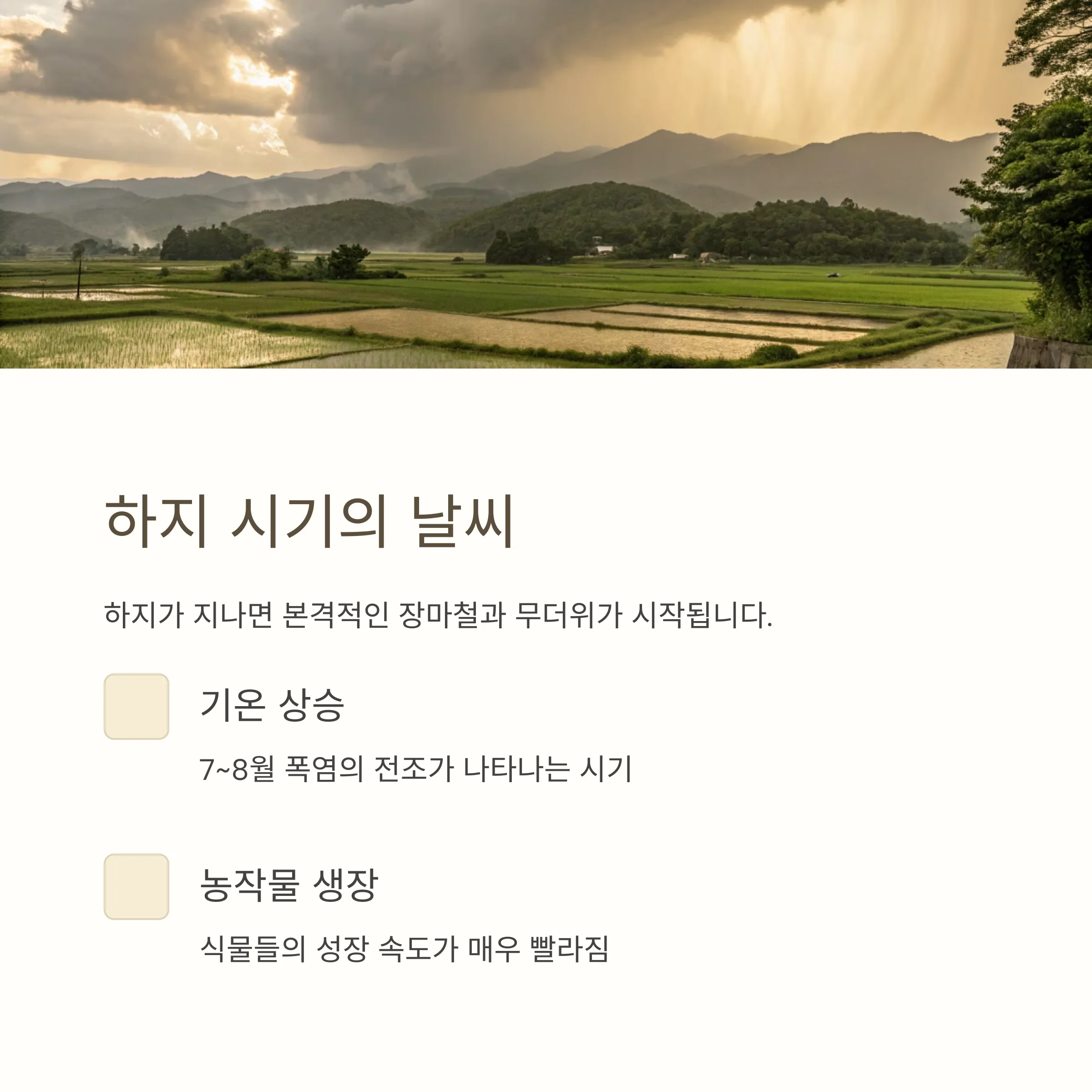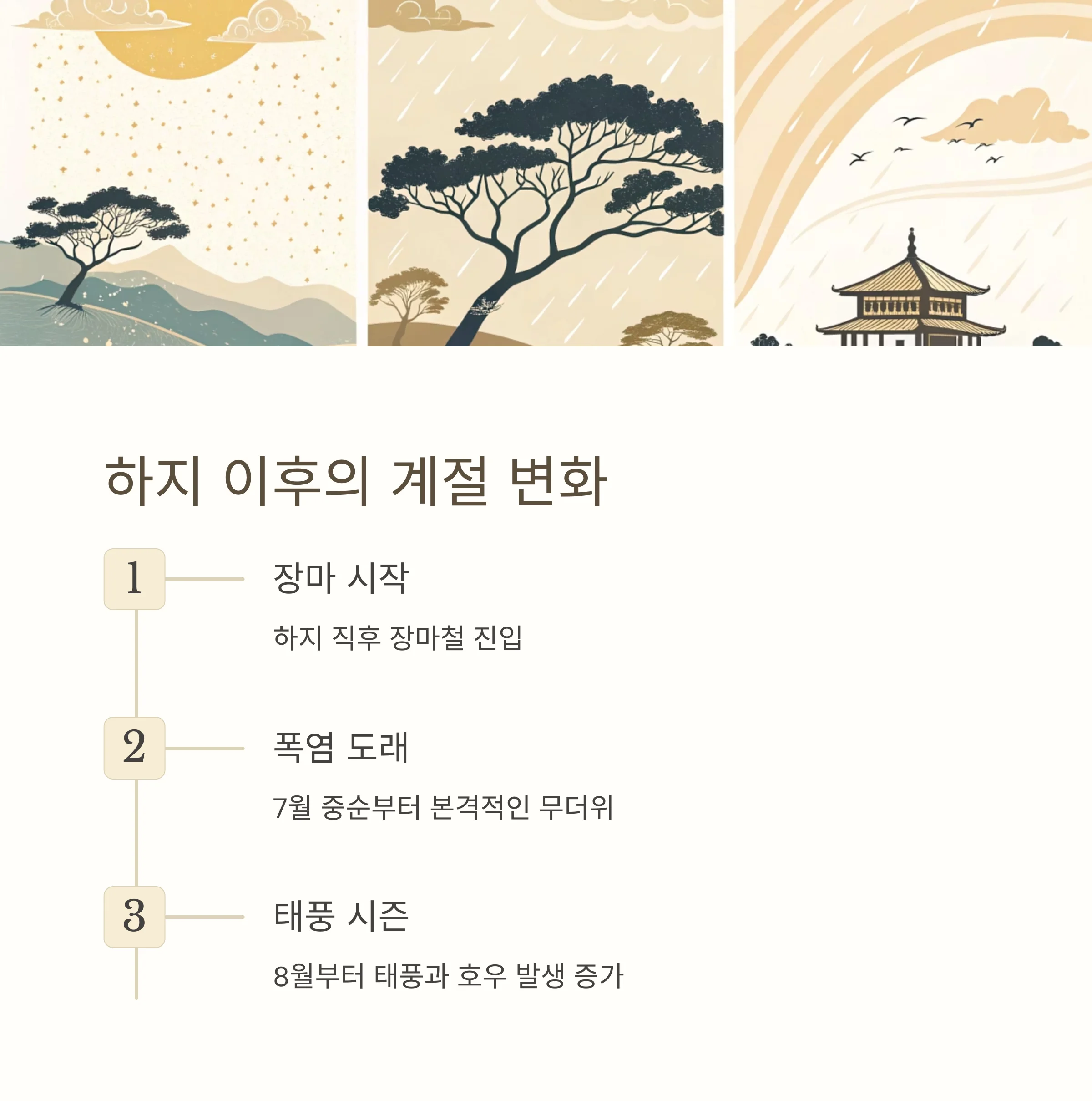 하지를 기점으로 여름이 본격화되며, 장마가 시작되고 뒤이어 폭염이 닥칩니다.