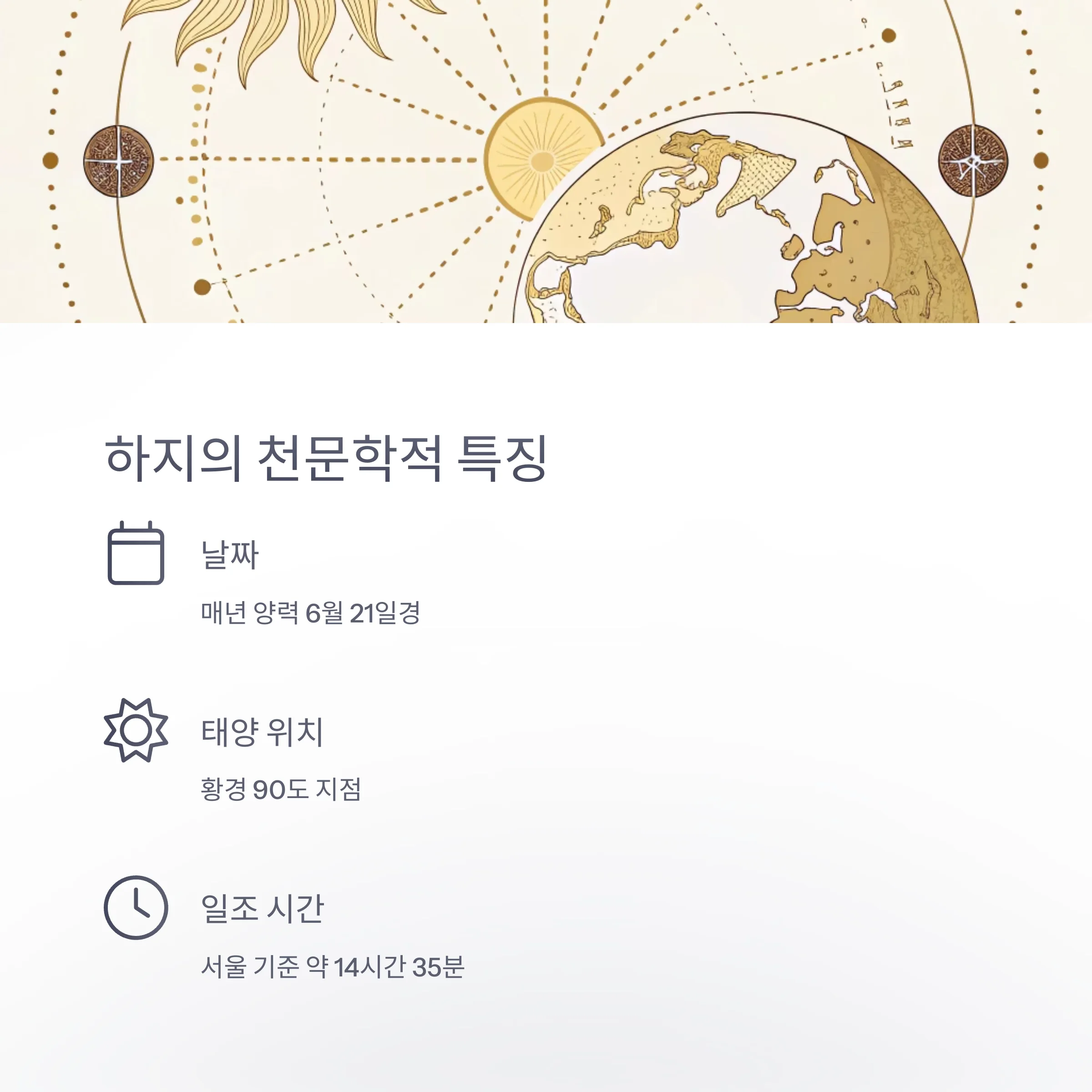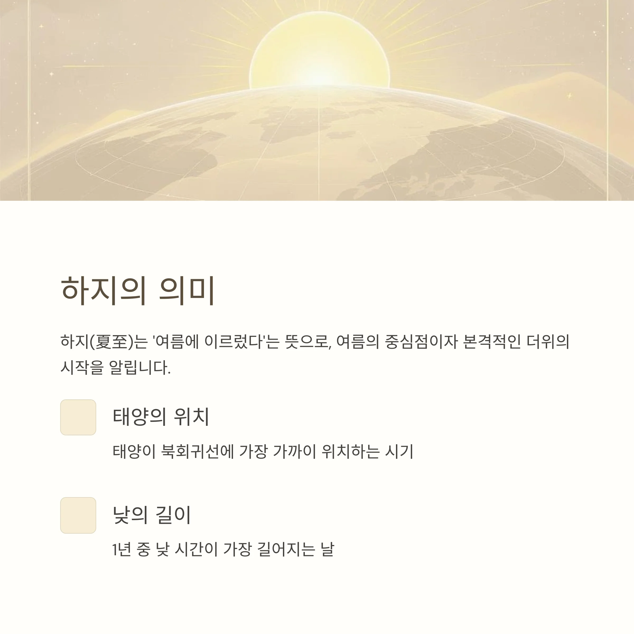 하지는 태양이 북회귀선에 가장 가까이 위치하는 시기로, 북반구에서는 이 날이 1년 중 낮 시간이 가장 깁니다.
