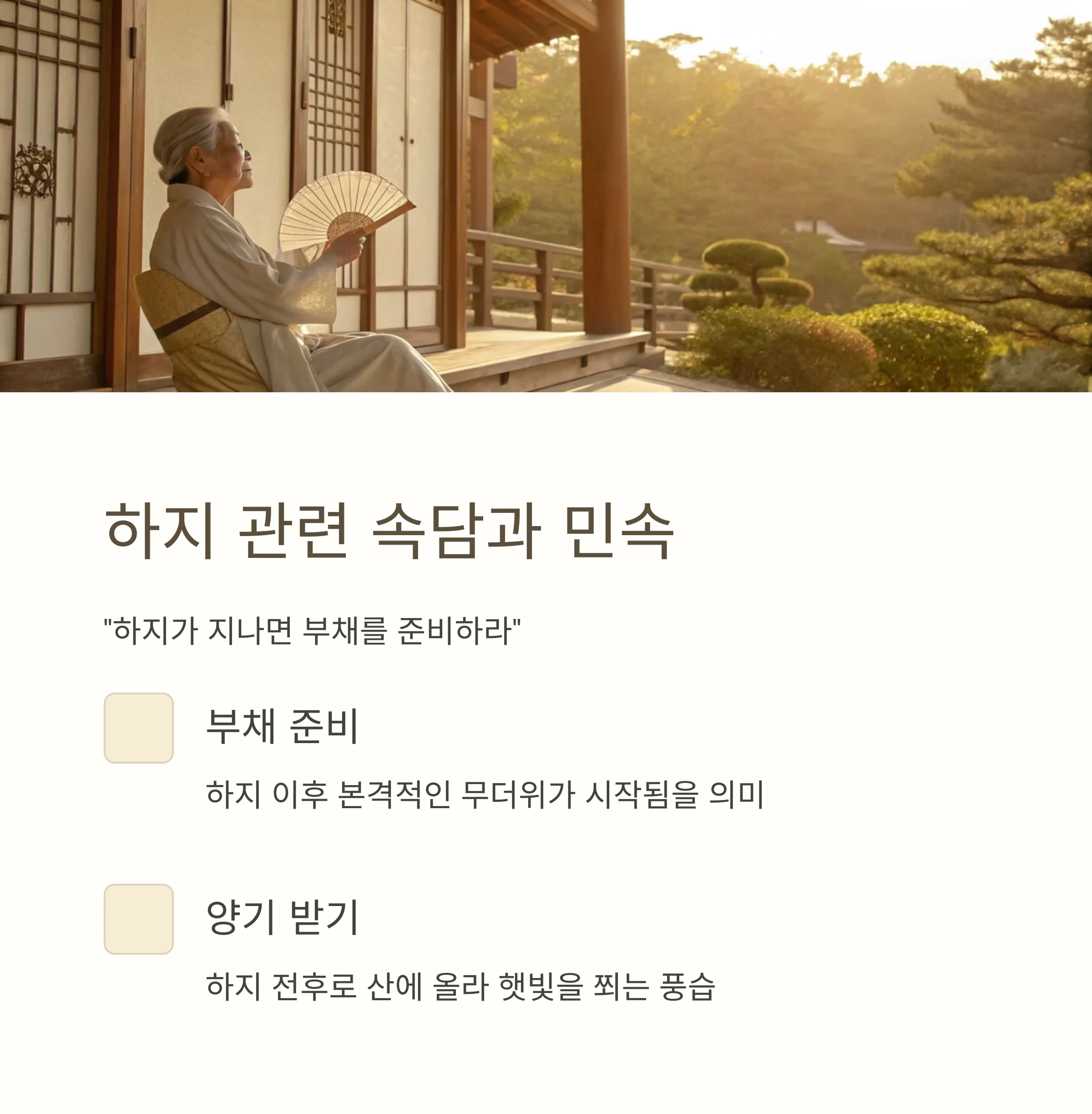 하지와 관련된 속담으로 "하지가 지나면 부채를 준비하라"는 말이 있습니다.