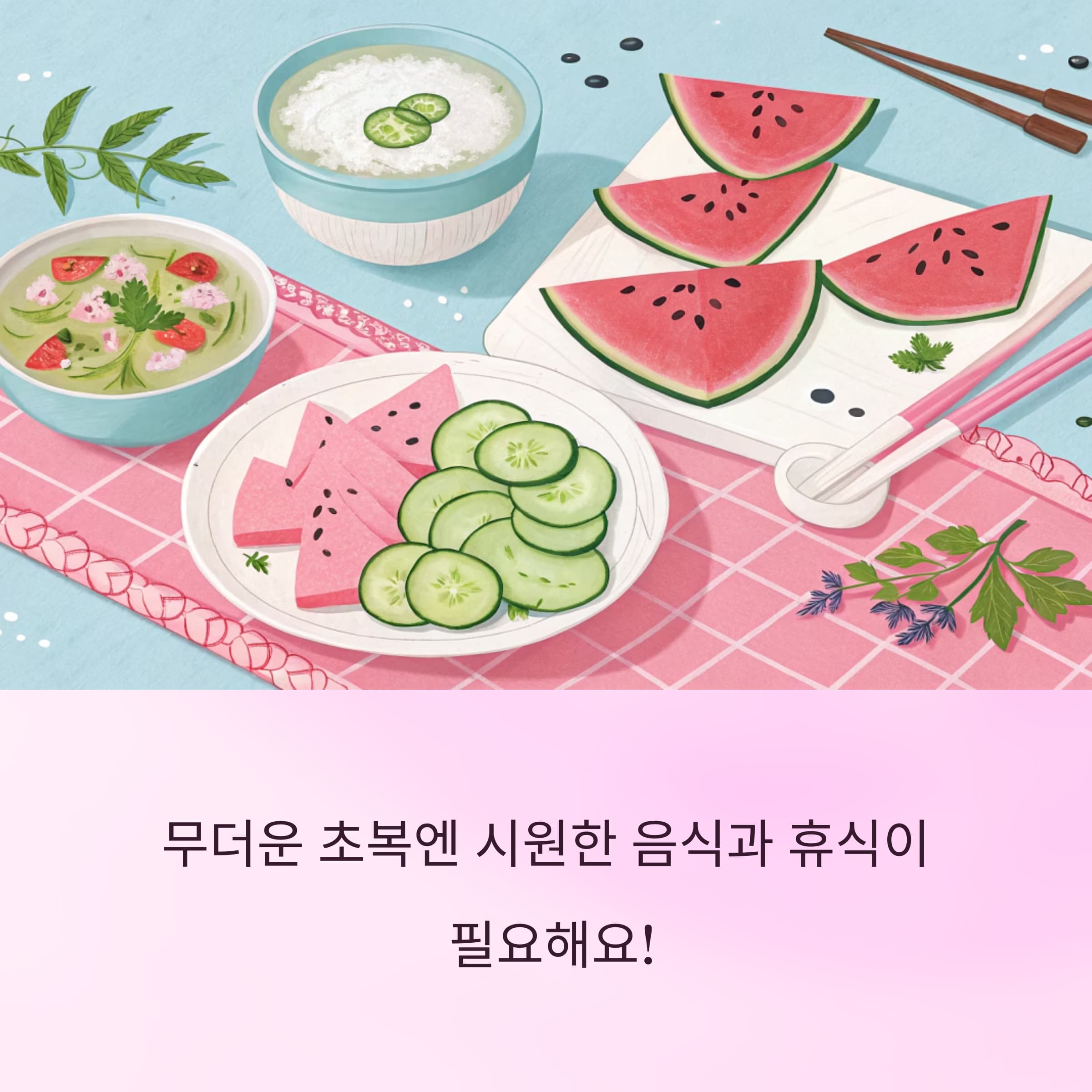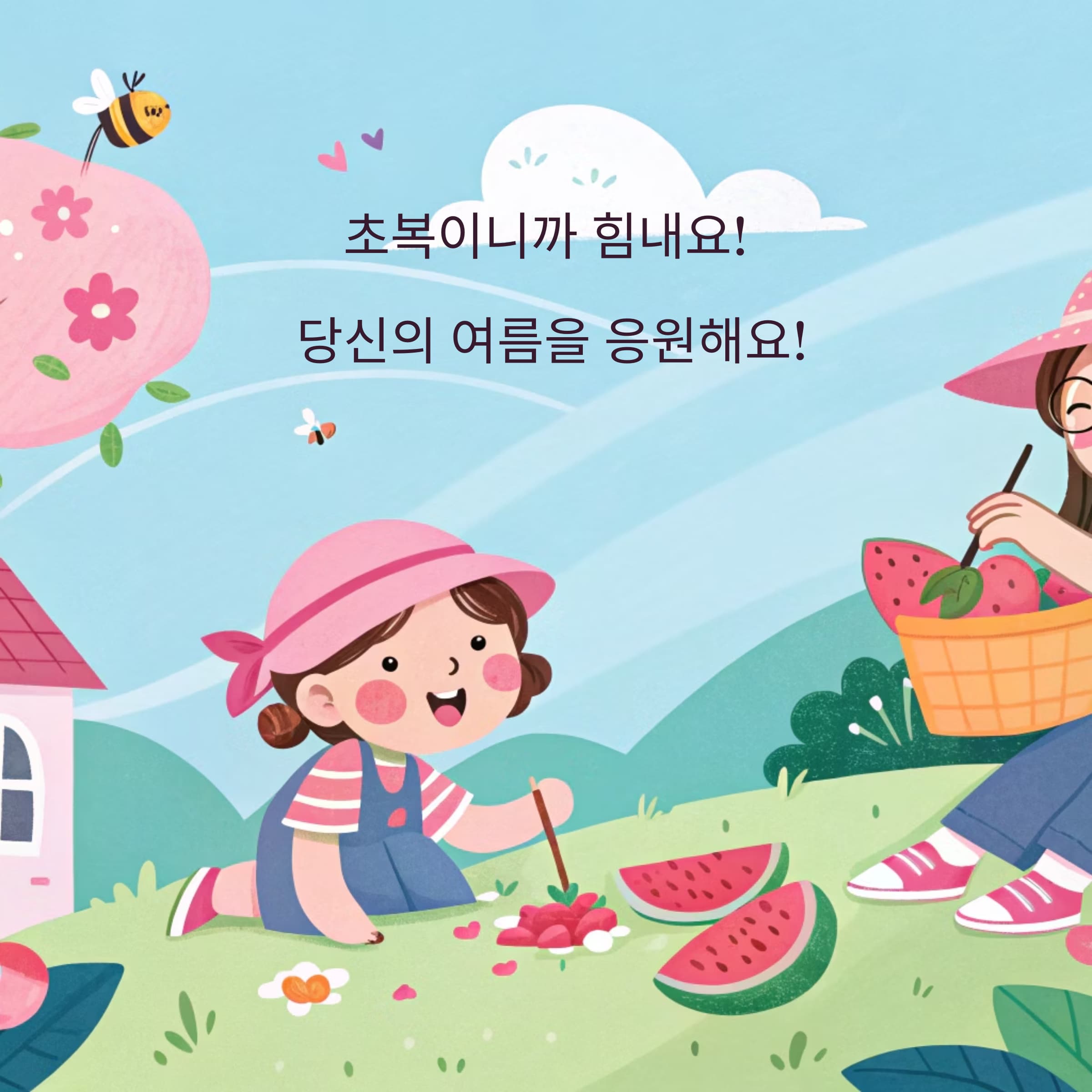 "초복에는 꼭 밥 잘 챙겨 먹고, 에어컨은 너무 오래 틀지 마요"라는 따뜻한 조언이 담긴 이미지.