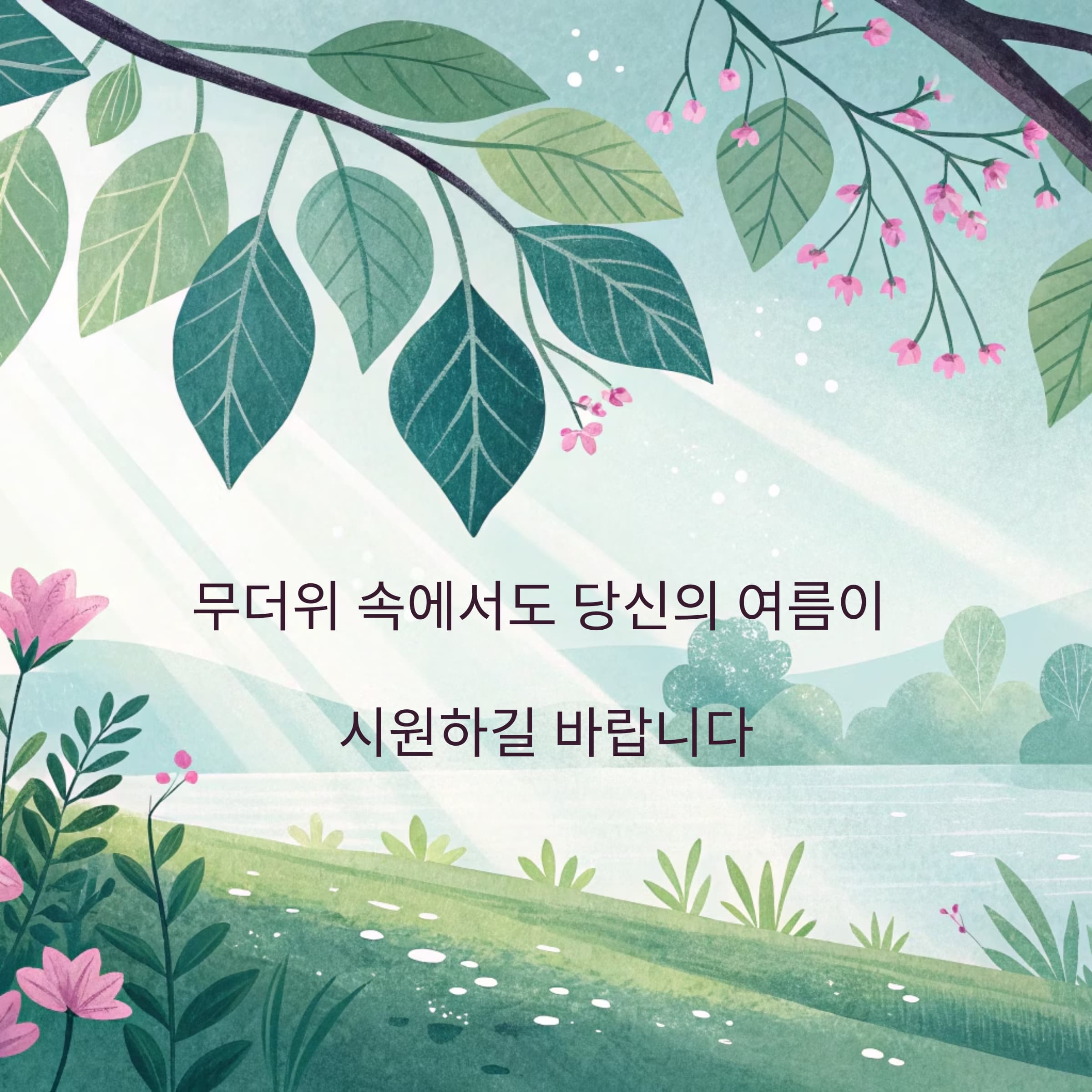 푸른 잎사귀와 한줄기 햇살이 비치는 배경에 "무더위 속에서도 당신의 여름이 시원하길"이라는 힐링 문구가 담긴 수채화풍 이미지.