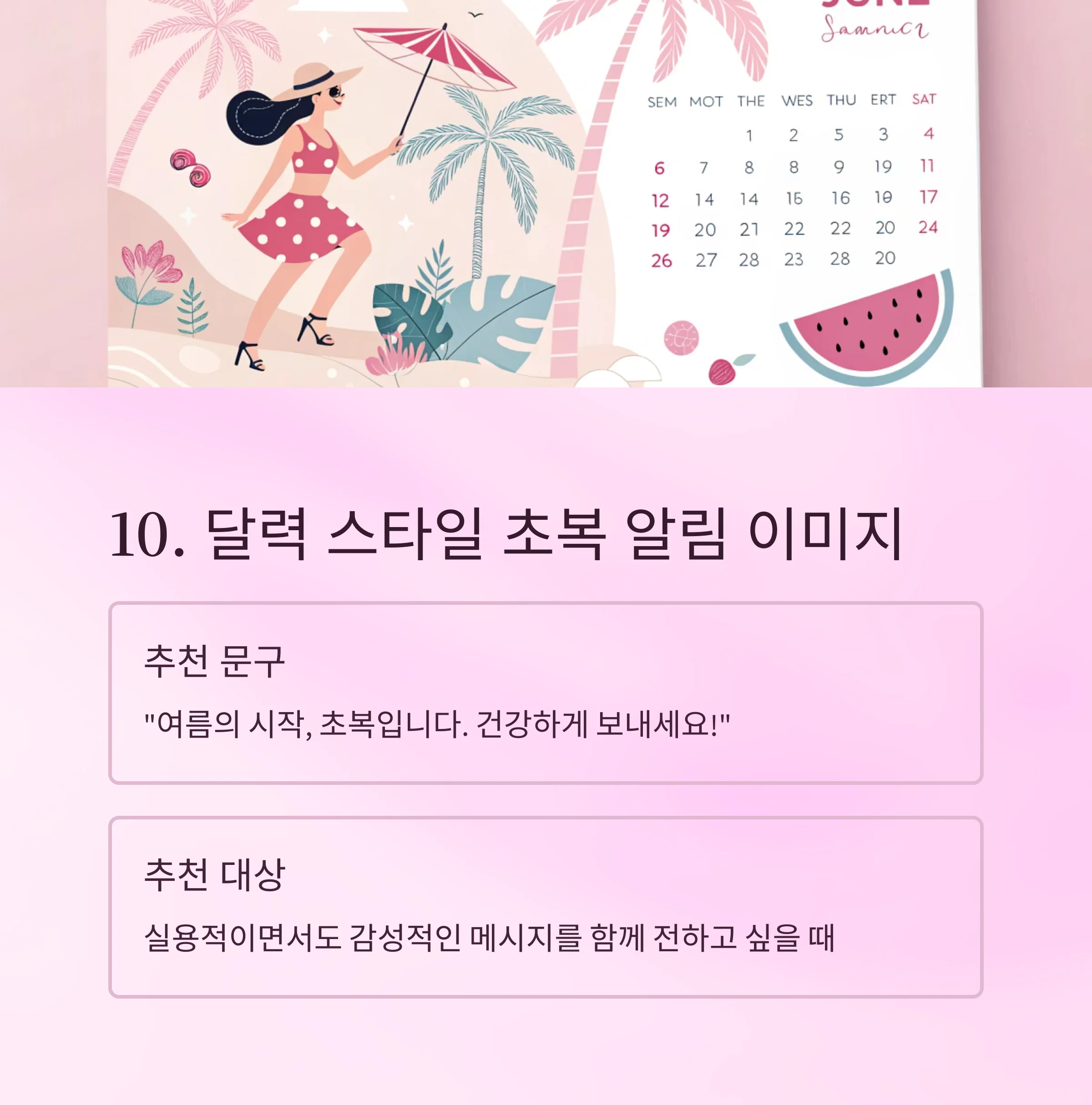 해당 날짜에 ‘초복’ 표시가 되어 있고, 하단에는 "여름의 시작, 초복입니다.
