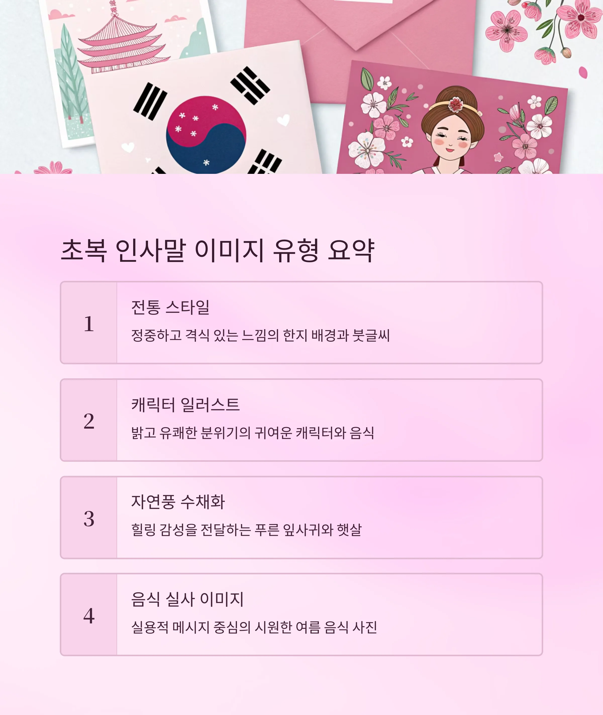 삼계탕, 오이냉국, 수박 등 시원한 여름 음식이 담긴 실사 이미지에 "무더운 초복엔 시원한 음식과 휴식이 필요해요!"라는 현실적인 인사말이 더해졌습니다.