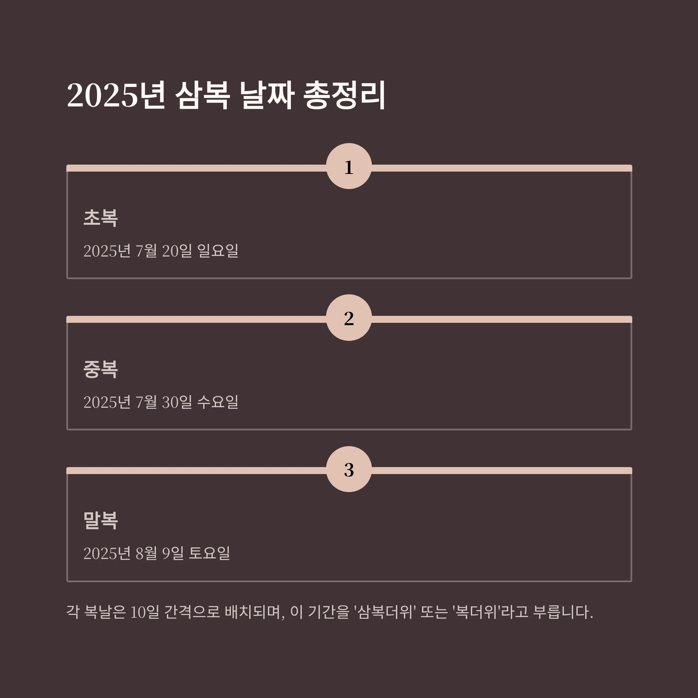 삼복은 초복, 중복, 말복으로 구성되어 있으며, 각각은 하지(夏至) 이후 일정한 간격으로 찾아옵니다.