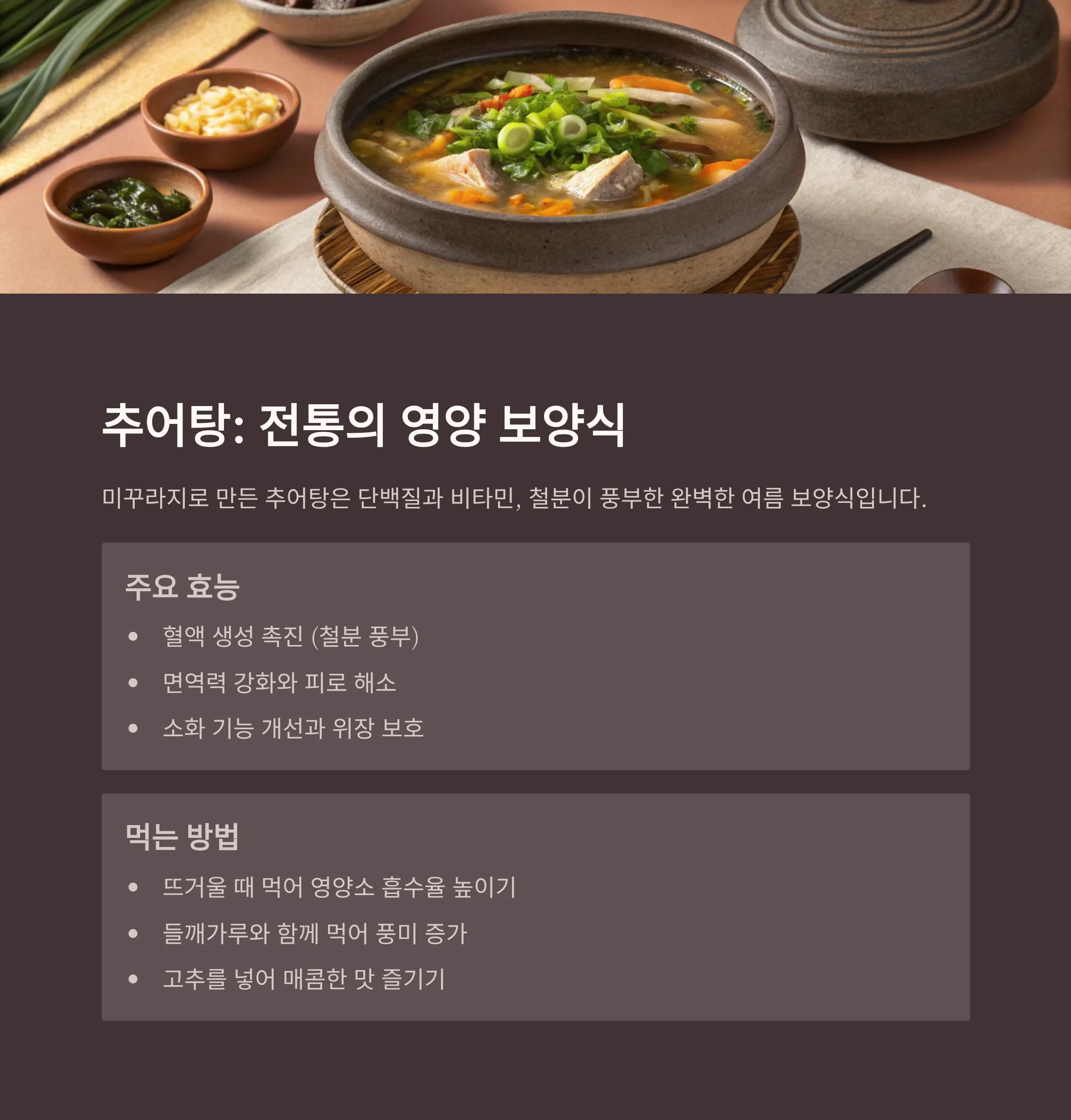 | 추어탕 | 미꾸라지 | 단백질 공급, 원기 보충 |