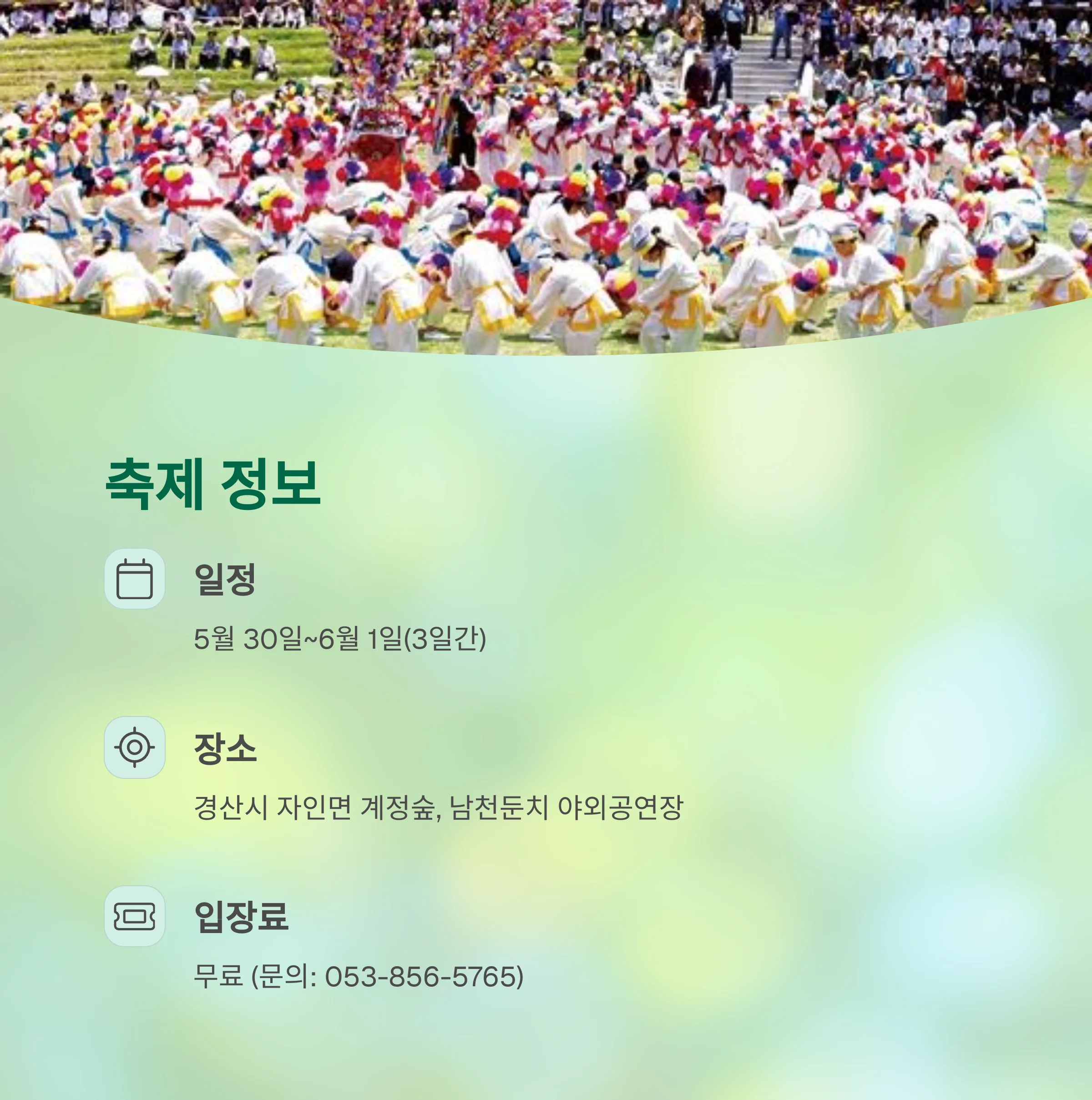 2025 경산자인단오제는 5월 30일부터 6월 1일까지 총 3일간 경산시 자인면 계정숲과 남천둔치 야외공연장에서 개최됩니다.