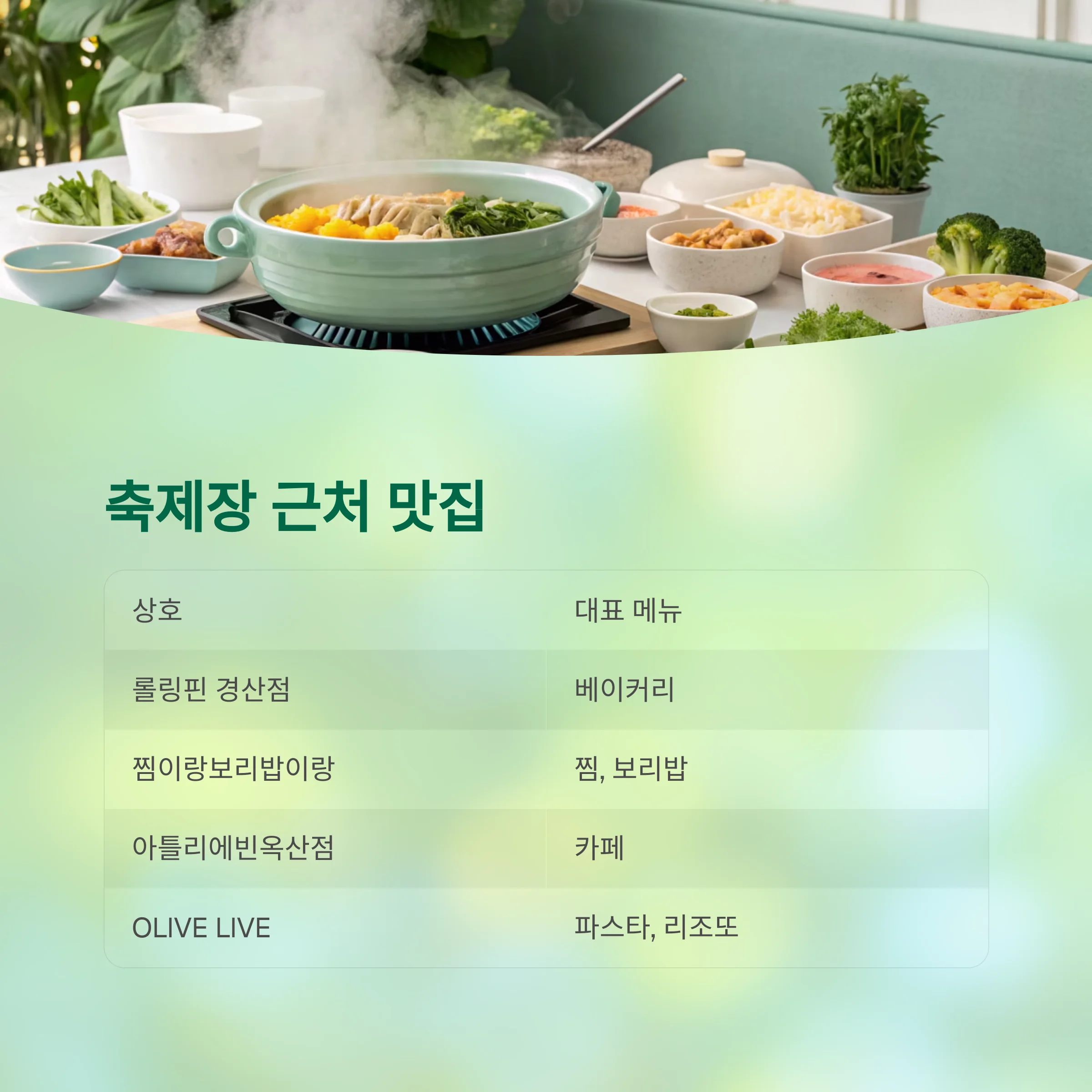 | 자인중학교 주차장 | 경산시 자인면 | 행사장까지 도보 약 5~10분 |