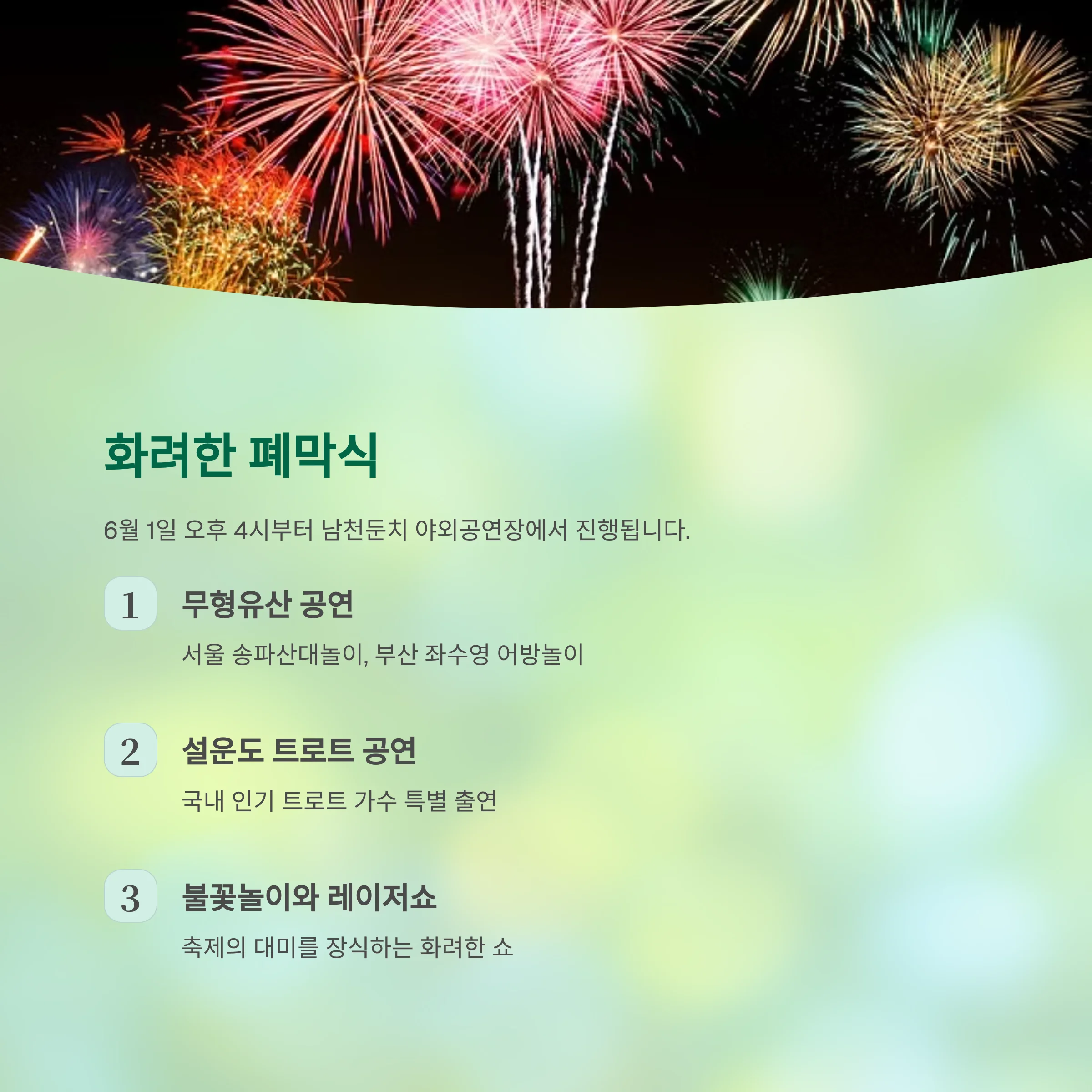 이날은 서울 송파산대놀이, 부산 좌수영 어방놀이 등 국내 대표 무형유산 공연이 이어지며, 가수 설운도의 트로트 공연과 불꽃놀이, 레이저쇼로 축제의 마지막을 화려하게 장식합니다.