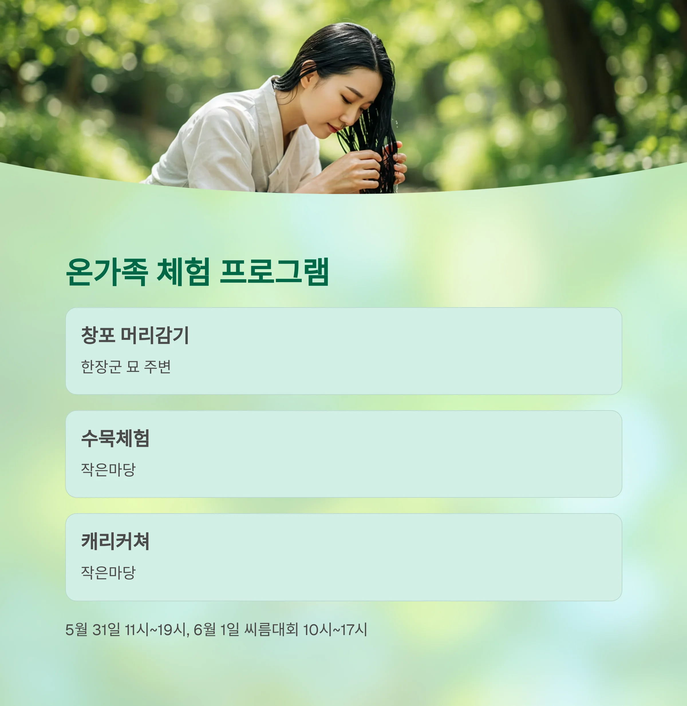 창포 머리감기(한장군 묘 주변), 수묵체험(작은마당), 가족연인들의 추억 캐리커쳐(작은마당), 국궁활쏘기(한장군 묘 주변) 등 다채로운 체험 행사가 준비되어 있습니다.