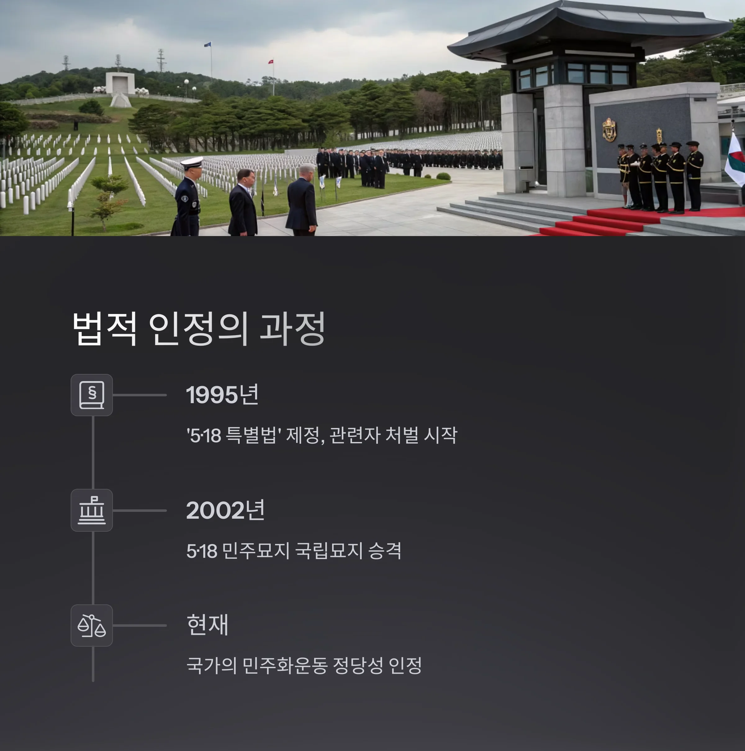 1995년 '5·18 특별법' 제정과 함께 관련자처벌과 희생자 명예 회복이 시작되었으며, 2002년에는 5·18 민주묘지가 국립묘지로 승격되며 공식적 예우가 부여되었습니다.